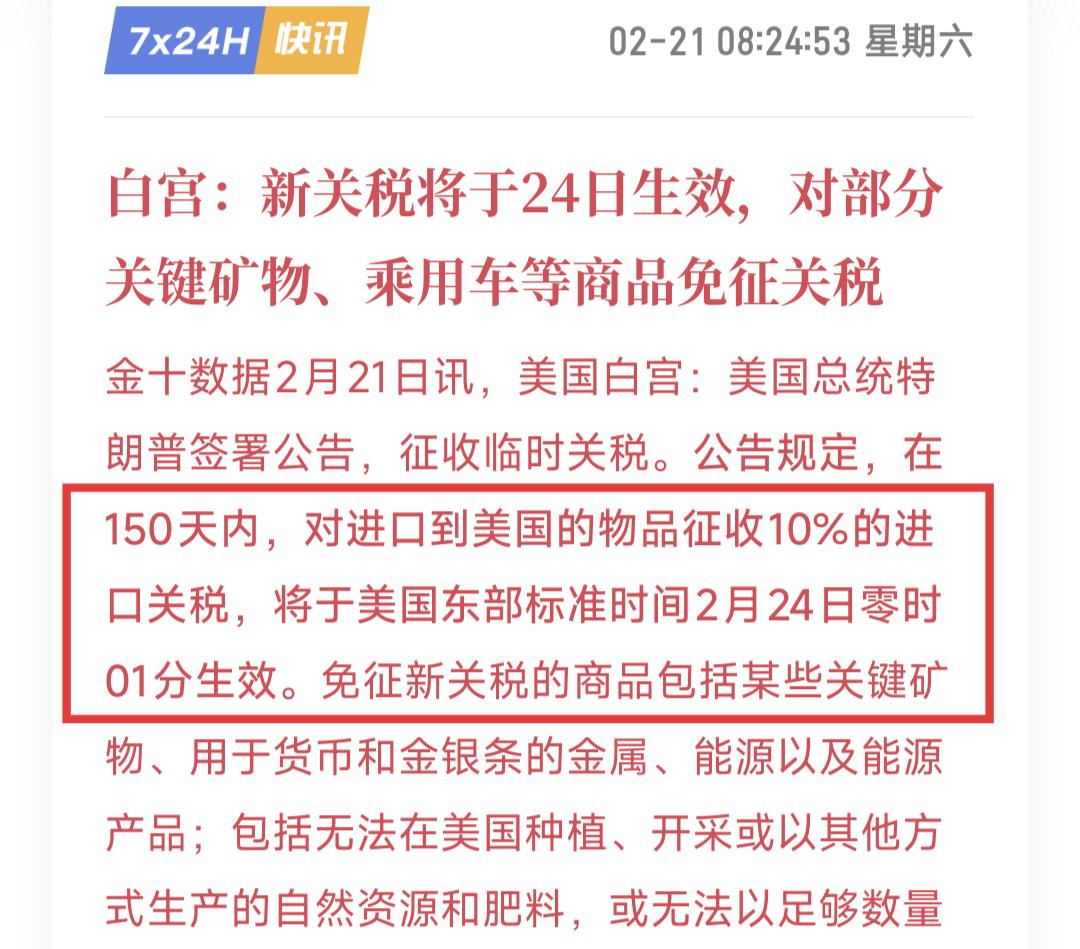 懂王太莽了! 最高法院判决征收关税违法,他就把气撒到全世界的头上:宣布对全球所有国家加征10%的关税,为期150天,美东时间2月24日起生效生效,正好赶在大A开门前。 你说这事闹的,朗子那边也到临界点了,随时有可能开干,这是又准备画k线了~ 可能有人觉得奇怪:美国最高法院不都判决懂王关税违法了吗?怎么懂王非但不收敛,反而还能加征关税? 大家要注意,美国最高法判决的是:懂王使用《国际紧急经济权力法》——IEEPA,征收的那部分关税违法,这块关税需要撤销且退税,但可没说懂王通过其他借口征收的关税违法,更没禁止懂王征收关税的权力。 比如这次加征10%,就是利用122条款,且之前通过232、301条款征收的关税,继续有效。 至于退税的钱,你就慢慢等去吧,懂王下台前你能收到钱,算你有本事。 也就是说,关税总额非但没什么变化,未来的不确定性反而还增加了:因为懂王很有可能哪天起床,觉得不爽、气不过,怎么还被自己提名的人给搞了?再给你加10%,哎,就是这么尿性。 当然,本次加征的10%有豁免品类:包括关键矿产、货币金属和金银条、药品及原料药、乘用车和部分卡车等,全是美国无法生产、但又急需且用量很大的物品。 如此看来,懂王基本处于无法无天的状态了:不光对外颠覆了运行大几十年的国际秩序,还对内打破了许多政治规矩,无论是国会、还是最高法,基本都拿他无可奈何。 有人说那中期选举懂王败选了,是不是会好一点? 恰恰相反——中期选举选的是众议院席位,而不是新总统。 如果共和党丢掉众议院多数,懂王仍然是总统,但美国国内的党争力度,将会比现在激烈得多。 过去一年发生的荒唐事,比如美国政府长期停摆,随意抓捕别国总统,ICE当街杀人等等,很可能只是一个序幕。 这次报复最高法院判决,加征临时关税,就是一个例子:对懂王而言,没有什么能够阻挡,我对权力的向往,谁敢阻挡MAGA,那他就是八嘎,我就让他西巴。 你想用规矩去约束一个企图推翻规矩的人,那事情演变到最后,就只能变为力量之争:谁拳头大谁说了算,谁力量多谁来定规矩。 目前这一幕,已经在全球各地开始上演了,包括美国国内。 还有小日子那边,也是一个隐患,小日本的国债和国内经济,绝对是一颗定时炸弹,随时有可能爆掉。 最后希望朗子挺住。