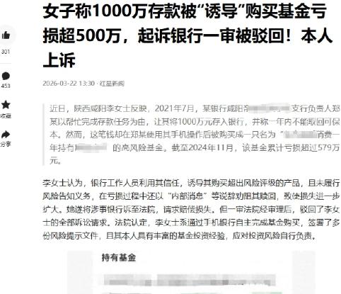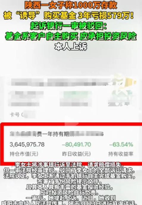 “ 冤不冤?”陕西咸阳,一女子手握1000万存款。某银行负责人郑某因存款任务未完成,求女子帮忙存入该行,承诺1年不取保本。女子3年后查询发现,存款变成了购买基金,亏损579万。女子起诉,一审驳回诉求,她不甘心提起上诉。 这事发生在2021年7月,李女士把钱存进中国农业银行咸阳帝都花园小区支行,郑某当时讲得很“稳”:帮个忙、放一年、保本。 更关键的一段在细节里:操作不在柜台前完成,李女士在办公室把手机交给对方操作,自己没盯屏幕,也没留存当场凭证。 等到需要用钱再去查,资金已进入“东方品质消费一年持有期混合A(012506)”这类混合基金,还带一年持有锁定期,能不能赎回、何时赎回都受限制。 到2024年11月左右,1000万只剩约421万,亏损5,790,000元。 李女士说风险测评被改成“激进型”,还准备了录音和现场证人;银行一审的说法更“流程化”:手机银行要输密码、要勾选文件,李女士又有基金投资经历,法院据此认定自主购买、风险自担。 案子进入二审,庭询谈话定在2026年3月23日。 很多人盯着“亏579万”这串数字,真正让人后背发凉的点在于一句话:把手机交出去那一刻,存款和基金的边界就被抹平了。 普通人对银行的信任,往往建立在“熟人+制服+办公室”这套场景里,郑某一口一个“李姐”,再加一句“我来操作更快”,大多数人都会松警惕。 可手机银行的世界讲证据,它只认密码、勾选、签署记录,不认你当时站在哪里、心里怎么想、对方有没有口头承诺。 一审驳回并不奇怪,奇怪的是我们长期把“有记录”当成“有真相”。手机在谁手里、风险测评由谁作答、购买指令由谁发出,这些核心事实若还原不出来,法庭就只能按系统链路走。 现实里“代客操作”最常见的外衣就是“帮你弄一下”,把复杂流程变简单,把风险披露变成一句“没事的”,再把客户的谨慎变成“签了就行”。 等行情一波动,所有温柔都转成冷冰冰的那句:自己点的。 更值得聊的是“任务”。郑某的起点是“存款任务没完成”,落点却变成“基金销售”。 这背后藏着一条很现实的链条:基层网点的考核常常把存款、基金、保险、贵金属等指标打包压下去,谁完成谁得分,谁掉队谁挨批。 指标一重,人就容易把客户当“资源”,把信任当“通行证”,把合规当“可操作空间”。你以为在帮熟人保饭碗,熟人可能在用你的钱保自己的业绩。 再看产品本身,“一年持有期”这类设计,对普通储户极不友好:你想止损,未必能立刻走;你想赎回,可能被劝“再等等”;你想追责,流程里又写着“已知晓风险”。 这就形成一个闭环:买入快、退出难、举证更难。 李女士说对方在可赎回窗口还劝阻她不要赎回,这类细节若能被录音证实,对二审会很关键,它能说明“销售关系”并没结束,银行人员仍在影响客户决策。 这件事也提醒所有人,争论“她有没有投资经验”意义不大。投资经验解决不了信息不对称,更抵不过“信任关系+代操作”这种组合拳。 现实里不少人早年买过一点基金,系统就给你贴上“懂行”的标签;等到大额资金被引导进高波动产品,标签又成了责任的挡箭牌。 经验不该被用来减轻机构的注意义务,尤其是面对大额资金、非现场操作、熟人营销这三种高风险场景。 往外扩一点看,类似纠纷在全国并不稀罕:有的走“线下推介、线上下单”来绕开双录;有的让客户在营业大厅“自己点几下”;还有的直接在办公电脑上帮客户操作转账购买,事后就剩一句“系统显示你同意”。 法院在一些案件里会让银行承担部分责任,比例从三成到更高都有,取决于是否存在代客操作、是否尽到适当性义务、销售过程能否回溯。 换句话说,李女士想翻盘,不是靠“我觉得冤”,靠的是证据把“流程真实”打穿:录音里有没有“保本”诱导、证人能不能证明手机由谁操控、风险测评篡改有没有技术痕迹、交易时段与在场人员能不能对应得上。 这事说到底,考验的不仅是一个案件的输赢,更是银行销售这条链路能不能被看见、被追责。钱在账户里属于你,指令在系统里未必属于你。 把手机交给别人操作这一步,很多人做过,很多人还会做;问题在于,出了事该由谁承担代价,不能只靠一句“你点的”。 你觉得二审更该重点查什么:录音内容、风险测评改动、还是当时“办公室操作”这一环节的责任边界?评论区聊聊。