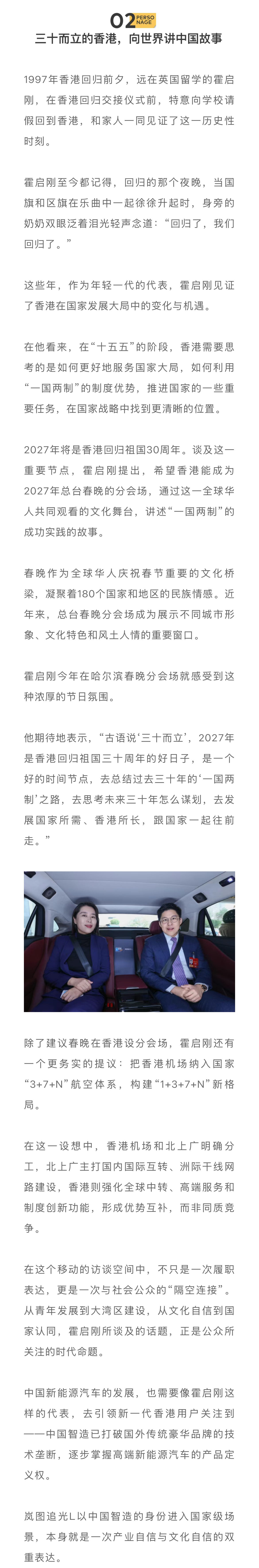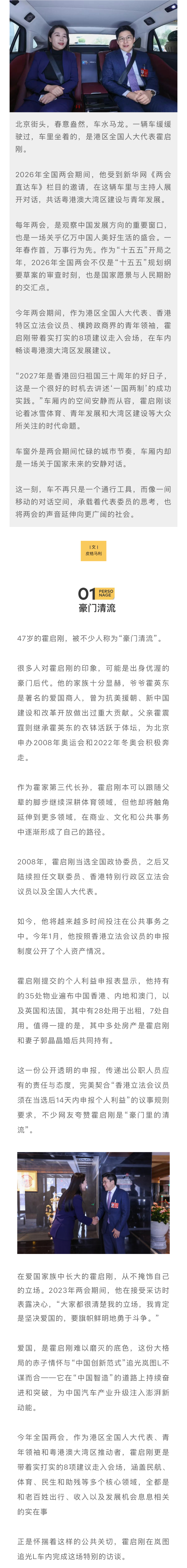 “2027年是香港回归祖国三十周年的好日子,这是一个很好的时机去讲述‘一国两制’的成功实践。”车厢内的空间安静而从容,霍启刚谈论着冰雪体育、青年发展和大湾区建设等大众所关注的时代命题。 车窗外是两会期间忙碌的城市节奏,车厢内却是一场关于国家未来的安静对话。