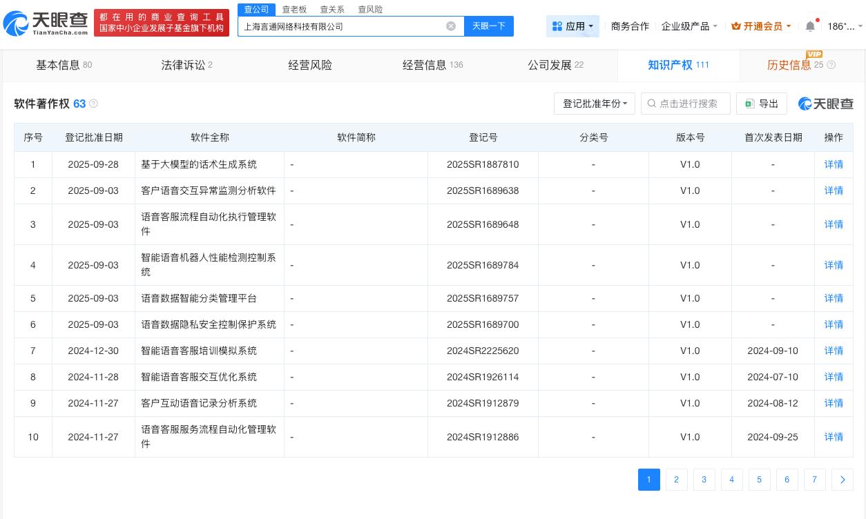 AI骚扰电话灰产涉事公司已登记多个软著权 AI骚扰电话灰产涉事公司拥有多项通话专利 据报道,长沙70多岁老人一年间接到300多个骚扰电话。其背后涉事公司涉及上海言通网络科技有限公司等。 天眼查App显示,上海言通网络科技有限公司成立于2009年1月,法定代表人为沈悦,注册资本1000万人民币,经营范围包括从事网络科技、智能科技、通讯科技、物联网科技、计算机科技领域内技术开发、技术转让、技术咨询、技术服务等,由沈悦、李闯、上海欢言企业管理中心(有限合伙)共同持股。知识产权信息显示,该公司已登记60余项软件著作权,包括“基于大模型的话术生成系统”“智能语音机器人性能检测控制系统”“语音客服流程自动化执行管理软件”等,此外还曾申请“贷款催收方法及系统”“可打断式语音处理系统和方法”等通话相关专利。 天眼查信息: