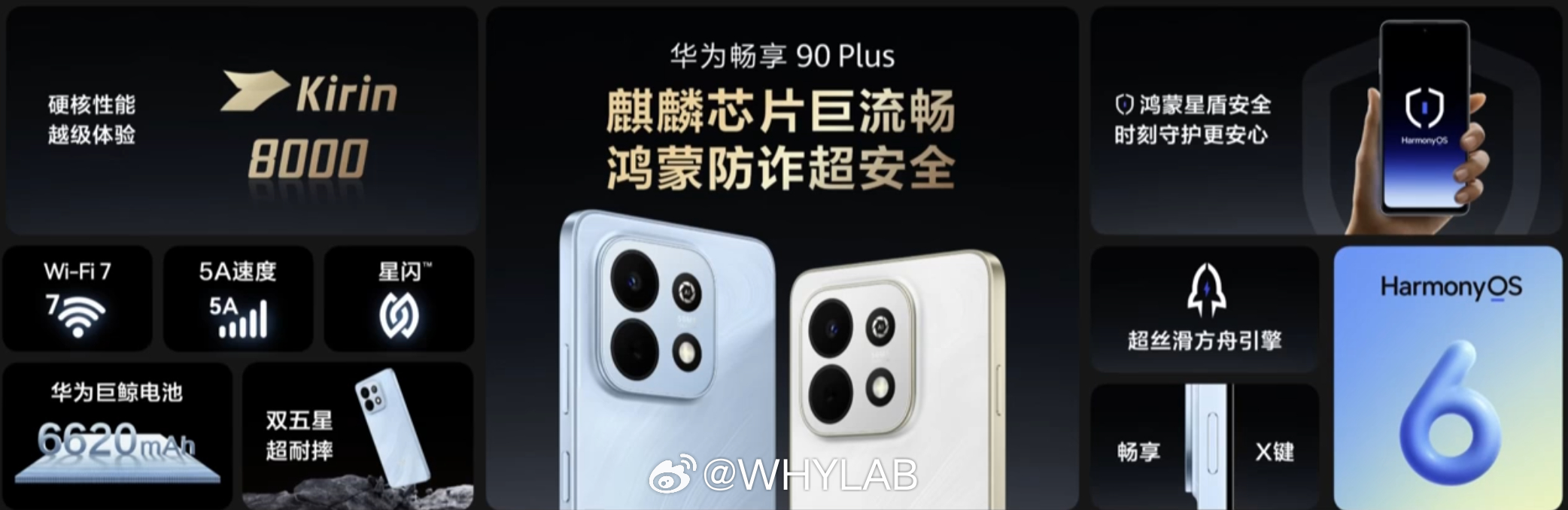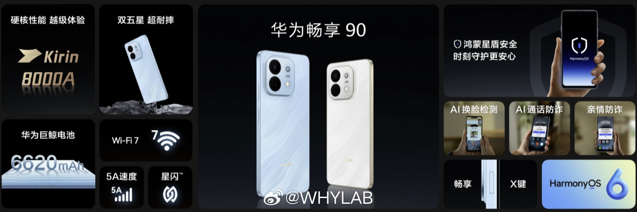- 其他: 厚 8.32mm,重 212 克,玄甲机身架构,星海蓝、羽沙白、星空黑 3 款配色,侧边指纹,红外遥控,IP64 防尘防水,HarmonyOS 6,WiFi-7,畅享 X 键,系统级防诈。