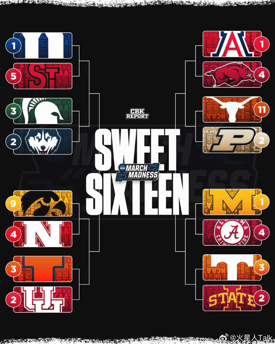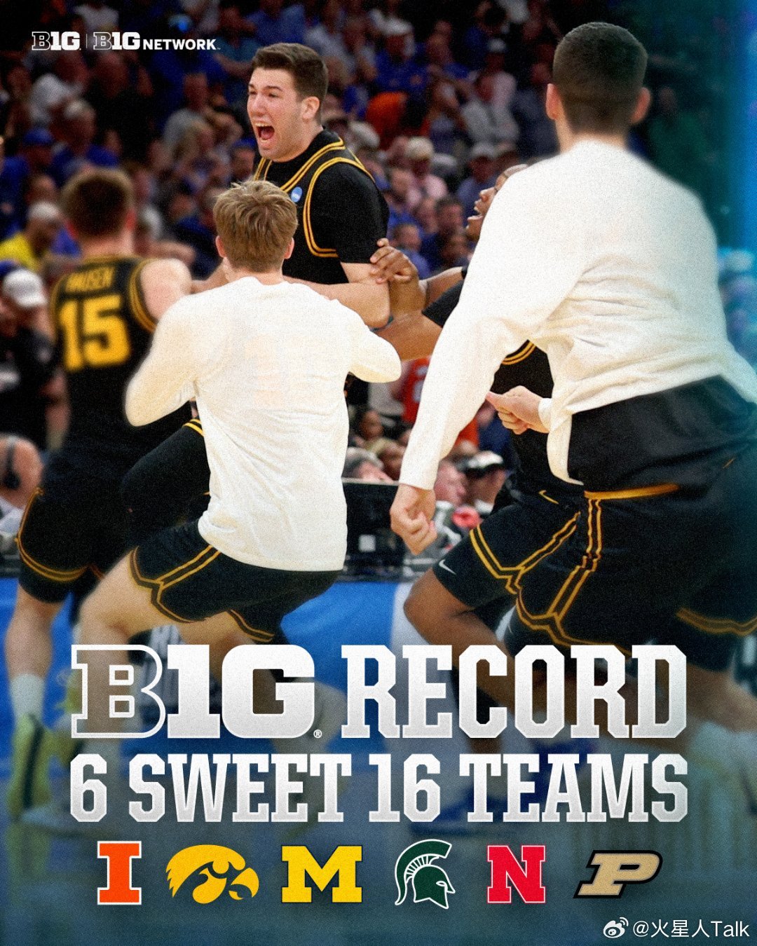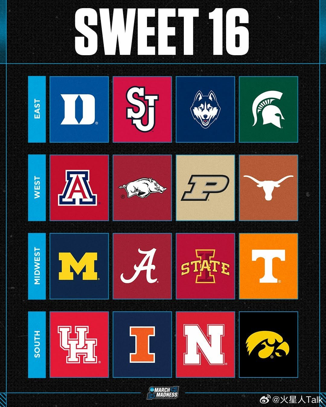 2025-2026赛季NCAA男篮疯狂三月 Sweet甜蜜16强,Big Ten联盟有6支球队,SEC联盟4支球队,Big 12联盟3支球队,Big East联盟2支球队,ACC联盟1支球队。