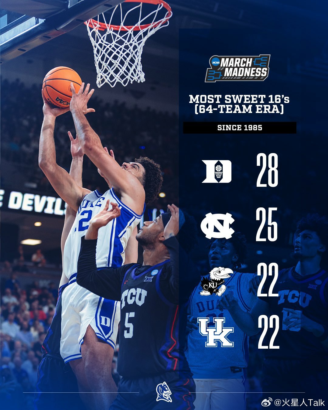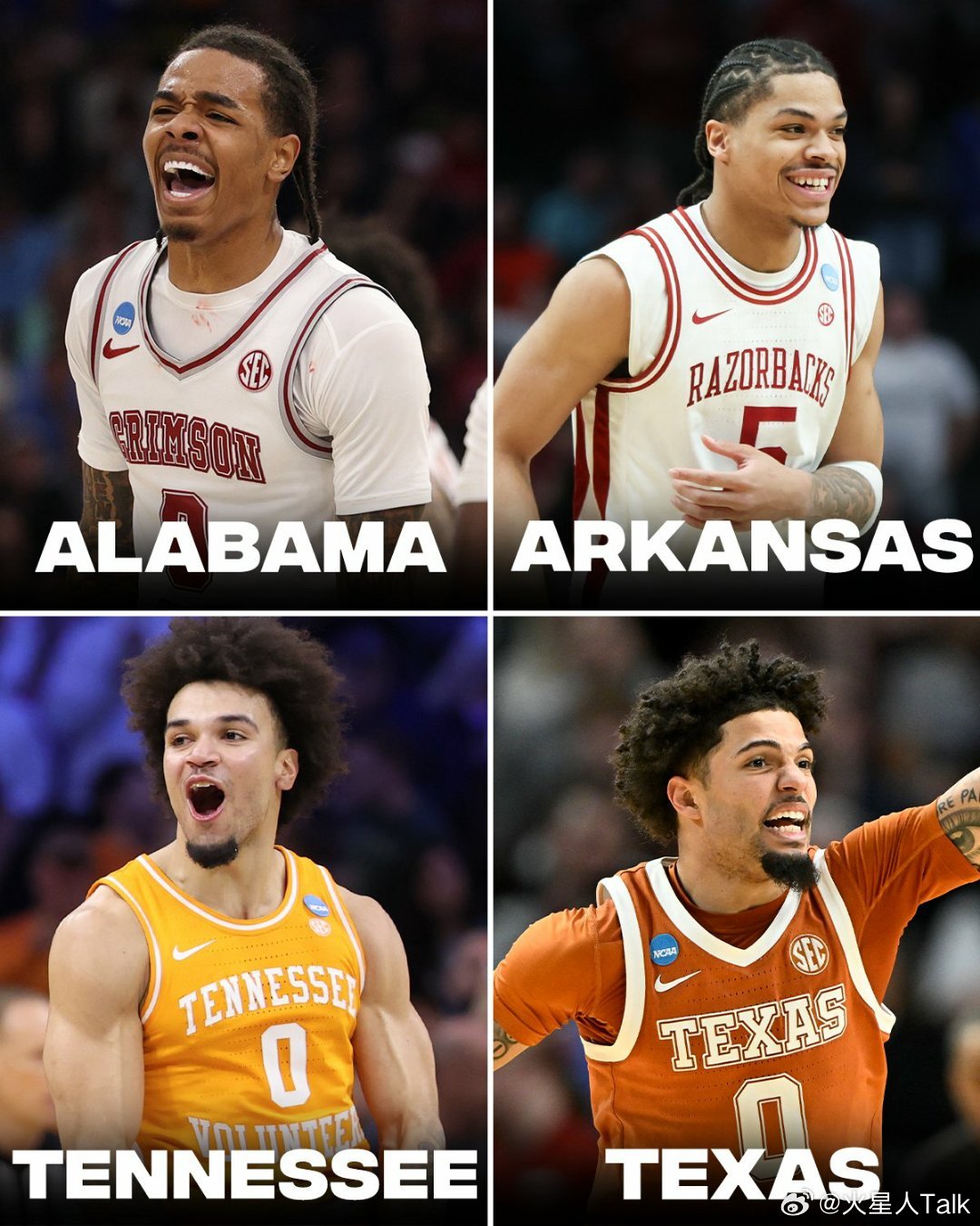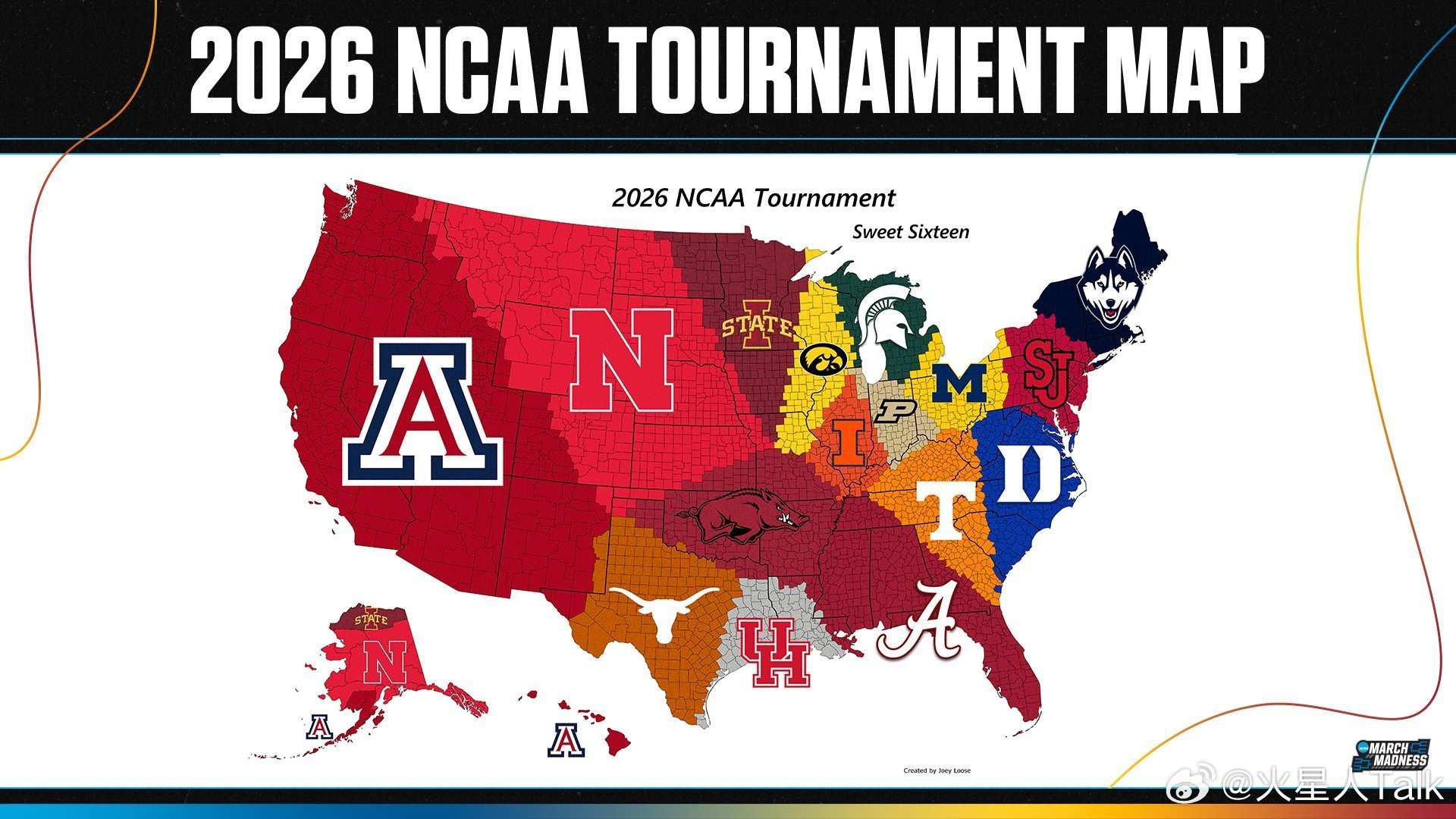 2025-2026赛季NCAA男篮疯狂三月 Sweet甜蜜16强,Big Ten联盟有6支球队,SEC联盟4支球队,Big 12联盟3支球队,Big East联盟2支球队,ACC联盟1支球队。