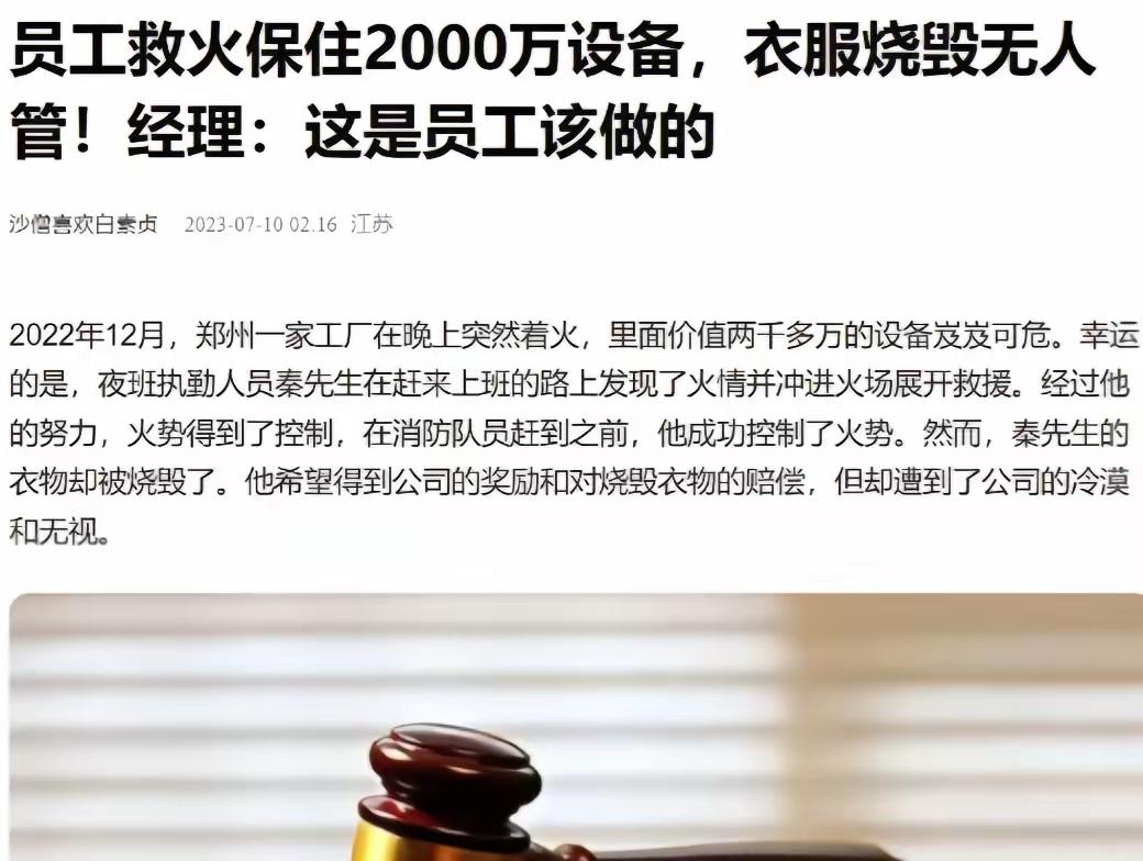 “心凉透了!”河南,一名男子上班时救火,保住2000多万的电脑设备。因为老婆送的衣服被烧坏,他想让公司赔一件,谁知负责人的话让他傻眼了,“这个和我们没关系!” 那天厂区里突然燃起大火,现场瞬间陷入混乱,浓烟滚滚热浪逼人,面对突发的危险,所有人的第一反应都是撤离,毕竟生命最重要,这是人之常情,没人会指责什么。 可这名男子看着火势不断蔓延,目光紧紧锁住了设备区,他比谁都清楚,那里的一批机器,不是普通的办公设备,而是公司的核心家当,压着公司的成本、订单和利润,一旦被大火烧毁,后果不堪设想。 火苗蹿起来的时候,别人往外跑,他往里冲。不是不怕死,是脑子里那根弦绷得太紧——两千多万的设备,要是烧没了,公司得缓多少年?他没功夫想这些,拎起灭火器就扑了上去。 烟熏得睁不开眼,呛得嗓子像刀割,他硬是咬牙顶住了。一件衣服烧得千疮百孔,那是老婆刚送他的生日礼物,他一直舍不得穿,今天头一回上身。可设备保住了,他觉得值。 事后他把烧坏的衣服拍了张照发给老婆,老婆回了一句“人没事就好,衣服再买”。就这一句话,他差点没绷住。老婆懂他,知道他干的不是傻事,是扛事。他心里暖烘烘的,想着公司总得说句暖心话吧。 第二天他拿着衣服去公司,没想多要,就提了一嘴,看能不能给补一件。他觉得这要求不过分,为了保住公司两千多万的资产,自己差点搭进去半条命,一件几百块的衣服,公司总该认吧。 负责人瞥了一眼那件烧烂的衣服,连头都没抬。“这个和我们没关系,你是自愿救火的,又不是公司安排你去的。”这话像一盆冰水,从头顶浇到脚底板。他愣在原地,半天没接上话。 自愿?对,他是自愿的。可那份自愿,是因为他把公司当成了家,把同事的事当成了自己的事。结果到头来,公司把他当成了外人。一件衣服的事,把人心量得明明白白。 法律上确实没有规定公司必须赔这件衣服,可这世上的事,不是全拿法条来衡量的。一个人拿命替你守了两千万的家当,你连一句“谢谢”都舍不得说,还往外推?这让人以后谁还敢往前冲? 有律师翻出《民法典》第一百八十三条,见义勇为者受损,受益人可以给予适当补偿。注意是“可以”,不是“必须”。可这种“可以”,恰恰是检验一个公司良心的试金石。你选择“不补”,法律管不着你,可人心管得着。 这件事传开后,网友的评论比大火还烈。有人说,这公司格局太小,一件衣服看清一个老板。有人说,这男子走的时候,带走的不是一件破衣服,是这家公司最后一点人情味。这话一点不假。 回过头看那场火,男子保住的不只是两千万的设备,更是公司活下去的希望。可公司给他的回应,却让他彻底寒了心。那种心凉,比冲进火场那一刻还冷。火能灭,人心凉了,可就再也捂不热了。 麻烦看官老爷们右上角点击一下“关注”,既方便您进行讨论和分享,又能给您带来不一样的参与感,感谢您的支持! 各位读者你们怎么看?欢迎在评论区讨论。