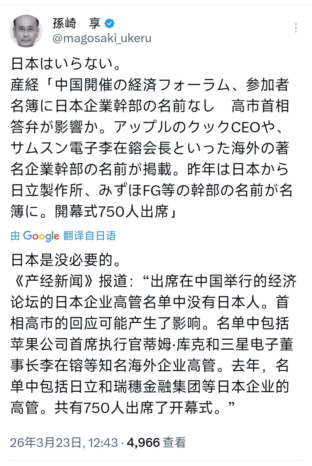 日本东亚共同体研究所所长、原日本外务省国际情报局局长孙崎享今天(3月23日)写道:“不需要日本了。产经新闻报道:‘在中国举办的经济论坛的参会名单中,未出现日本企业的高管姓名。是否与高市大臣的答辩有关?名单中却列有苹果公司CEO库克、三星电子会长李在镕等海外知名企业的高管姓名。去年,日立制作所、三菱UFJ金融集团(Mizuho FG)等日本企业的高管曾出现在名单上。本届论坛开幕式有750人出席。’” [机智]评几句:高市早苗严重干涉中国主权的言行,反噬中日经济关系,这场由日本极右翼政客亲手酿造的苦果,终究让日本企业吞下。这位执意发表涉台错误言论、叫嚣“台湾有事就是日本有事”的首相,将政治私利凌驾于国家经济利益之上,直接导致日本企业高管集体缺席中国重要经济论坛,与苹果、三星等外企高管的参会形成刺眼反差,去年日立、三菱等日企还位列名单,如今却彻底被排除在外,成为国际经贸舞台上的尴尬缺席者。这并非中方刻意针对,而是高市早苗触碰中国主权红线的必然结果,其一意孤行的政治操弄,让日本企业失去了深耕中国市场的宝贵机会,中日经贸合作的大门因她的霸权行径缓缓关闭,而这一切,都是日本选择极右翼政客掌舵的自食其果。