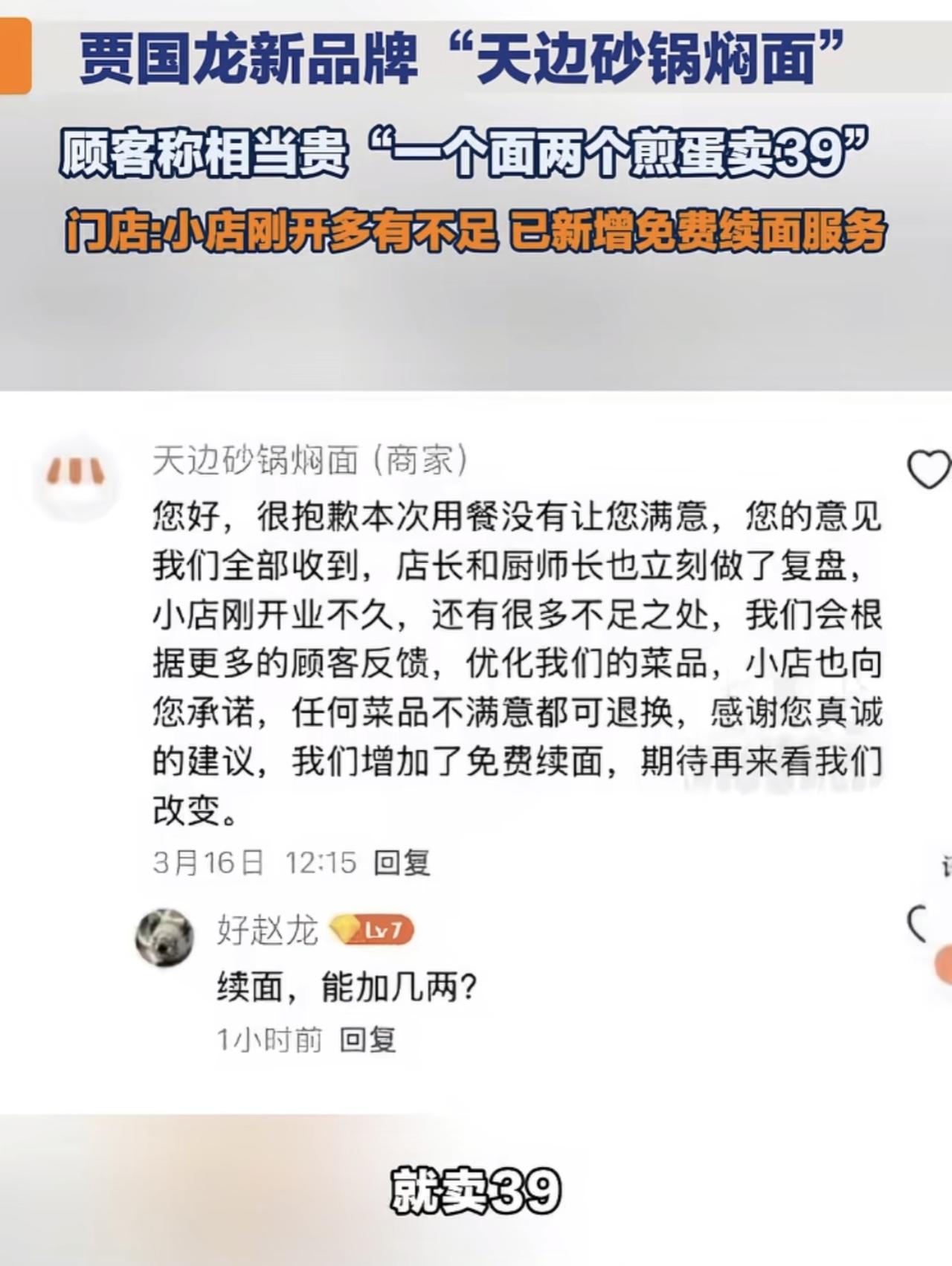 为了应对大家吐槽量少,贾国龙的砂锅焖面推出了免费续面的活动。如果有顾客觉得量少,没有吃饱的话,可以叫服务员免费帮忙续面。但是就是不知道他这个面是怎么续的,因为他本身就说的是现点现炒面,都是生的放进去炒熟了之后给顾客吃的。如果是免费续面的话,店里是提前炒好之后给顾客加上去。还是说直接再给顾客现炒一份。 店里还说了,如果你觉得菜品不满意的话,可以随时联系服务员退换,他们也是刚开业,有很多不足的地方,希望能多多指教。 不过也看得出来,如今大家去店里吃饭的话,真的就不用担心吃不饱了,因为有了免费续面。吃不饱再加就可以了。