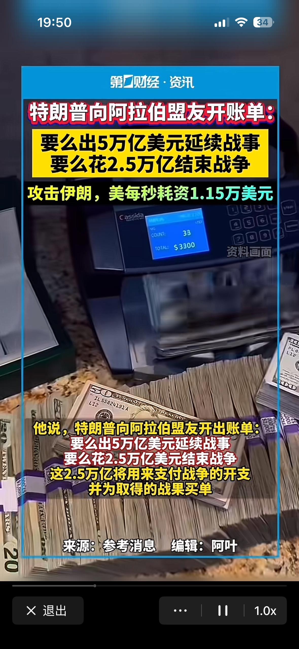 财经资讯报道了,特朗普为了保卫海湾国家开支巨大。为了持续的打击伊朗,让伊朗无法威胁周边国家特朗普给海湾国家列出了一份战争开支清单。 特朗普的意思就是大家一起出钱打击破坏中东地区安全的坏分子,给钱就继续打击伊朗,直到胜利。不给钱,大家一起看着办,受损的都是中东周边国家。