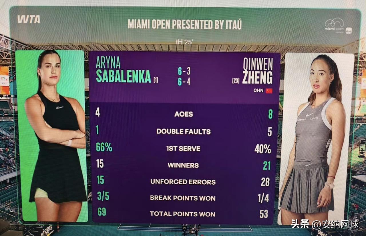 看数据,郑钦文的发球ACE球8:4好于萨巴,双误5:1有待改进。 40%的一发成功率还是很难赢萨巴的。 制胜分21:15也是好于萨巴。 非受迫失误28:15高于萨巴,需要改进。 破发效率1/4能提升一下就好了。 总结,还是自己的失误无论是发球双误还是非受迫性失误都太多了。 也就是想战胜萨巴,稳定性必须改进提升。 不是绝对没有机会,还是有的打的!