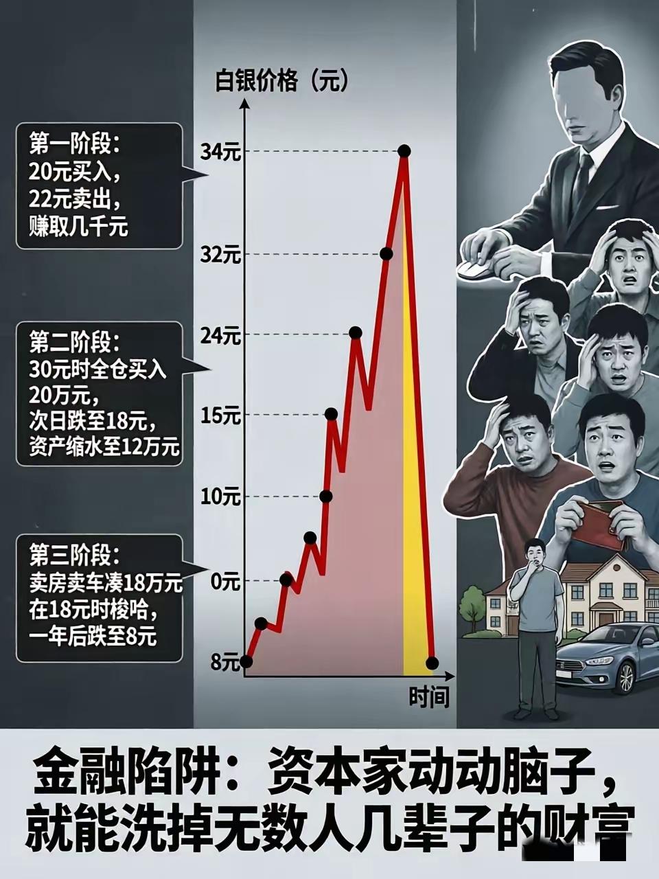 太扎心!普通人根本玩不过资本 最近白银暴跌刷屏,多少人亏到睡不着,这哪是投资,分明是精心设好的局! 多少人省吃俭用半辈子,攥着20万血汗钱不敢乱花。 资本家把银价从8块拉到34块,制造暴富假象。 先让你小赚几千块尝甜头,等你放下戒备、眼红疯涨, 在30块高位满仓冲进去,第二天直接跌到18块,20万瞬间缩水大半。 人心都是肉长的,亏了谁不急?卖房卖车凑钱在18块抄底梭哈,以为能翻盘,结果一年后跌回起点8块。一辈子的积蓄,被资本轻轻一拨,就灰飞烟灭。 这就是最真实的收割套路:给甜头→勾贪心→追高位→深套→补仓亏更多。 普通人靠勤劳攒钱,资本靠规则玩心理,咱们的工资扛不住杠杆,耐心扛不住震荡。 天上不会掉馅饼,不懂的东西坚决不碰,不梭哈、不跟风、不加杠杆,守住本金比什么都强。安稳过日子,比一夜暴富靠谱百倍! 你身边有人炒金银被坑过吗?有没有过追涨杀跌的经历?评论区聊聊,转发提醒家人远离金融陷阱! 金融陷阱 白银暴跌 投资风险 守住钱袋子