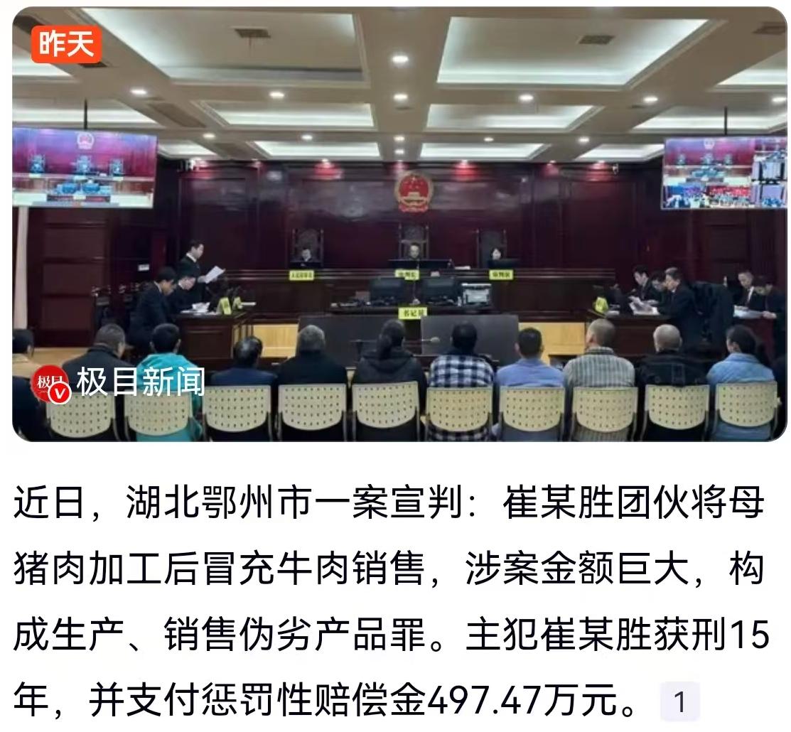 民以食为天,食以安为先。但总有一些利欲熏心的商家,为了贪图那点蝇头小利,把黑手伸向了百姓的餐桌。近日,湖北鄂州市宣判了一起让人触目惊心的“假牛肉”案,判决结果出来,真可谓是人心大快。主犯崔某胜因生产、销售伪劣产品罪,被判处有期徒刑15年,除了处以150万元的罚金外,还得支付高达497.47万元的惩罚性赔偿金。这一记重锤,狠狠砸在了那些企图在食品上动歪脑筋的人头上。 这事儿还得从几年前说起。根据披露的细节,从2022年12月一直到2024年1月28日,这一年多的时间里,崔某胜团伙就像勤劳的“搬砖工”一样,频繁地从屠宰场以及同伙李某柱那里购进母猪肉。母猪肉本身并不违法,但这帮人动了歪心思,他们雇佣李某勤、尚某学、崔某学等人,在租来的房子里搞起了“深加工”。经过一番不明所以的腌制、加工,原本口感粗糙、纤维粗大的母猪肉,摇身一变就成了市场上紧俏的“牛肉”。 很多人可能会纳闷,母猪肉和牛肉口感差别那么大,怎么会看不出来?正如网友吐槽的那样,“母猪肉嚼不动”,但这帮人显然在“以次充好”的技术上下足了功夫,利用加工手段掩盖了肉质的真实口感,再打着低价的幌子,忽悠了不少贪图便宜的消费者。这不仅仅是欺诈,更是对消费者身体健康的漠视。长期食用这种来源不明、加工环境堪忧的“伪劣牛肉”,隐患无穷。 这起案件的判决之所以解气,关键在于那个“惩罚性赔偿金”。497.47万元,这个数字可不是罚着玩的,它意味着不仅要让违法者倾家荡产,还要让他们付出沉重的经济代价。以往很多食品安全案件,违法成本过低,导致很多人心存侥幸。这次鄂州法院的判决,明确传递了一个信号:在食品安全上,没有“下不为例”,只有“重拳出击”。 对于咱们普通老百姓来说,这起案件也是一本实实在在的“避坑指南”。检察官在3月23日的以案说法中特意提醒,要警惕低价牛肉背后的陷阱。市面上牛肉价格相对透明,如果遇到价格低得离谱、口感却异常“紧实”或者怎么煮都煮不烂的所谓“特价牛肉”,心里可得打个大大的问号。 这起案件也给所有食品行业的从业者提了个醒:别把消费者的信任当儿戏。做生意讲究的是诚信,想靠弄虚作假发家致富,最终换来的只能是铁窗泪和巨额罚单。崔某胜团伙的结局,就是最好的前车之鉴。保障食品安全,需要法律的雷霆手段,也需要咱们消费者擦亮双眼。只有让假货没有市场,才能让百姓的餐桌真正安全。 以上内容仅供参考和借鉴