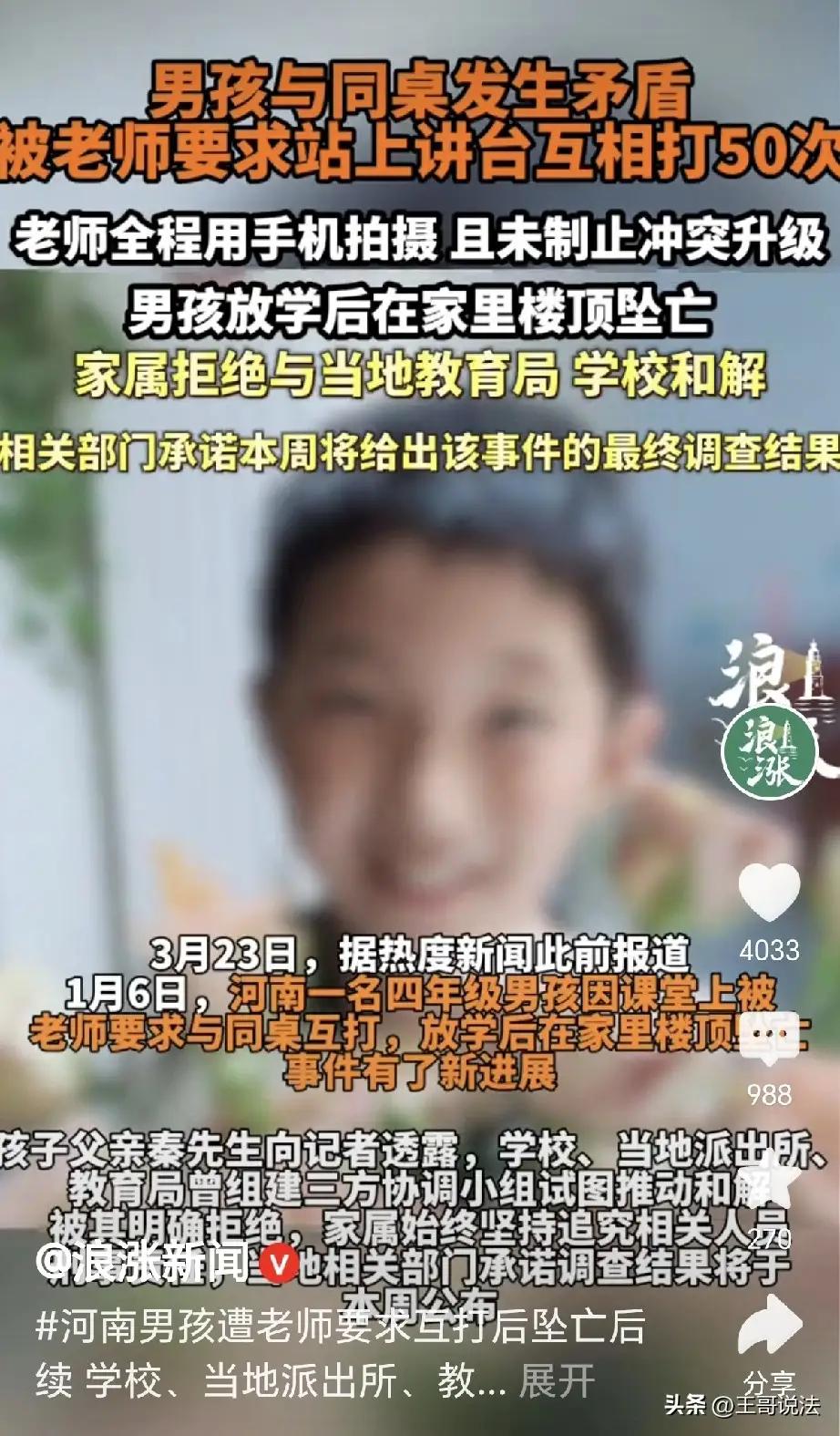 心碎河南!老师逼两娃互扇 50 耳光还录像,10 岁男孩跳楼身亡:不要赔偿,只要凶手坐牢! “心都碎了!”这不仅仅是一句感叹,更是河南一位父亲秦先生撕心裂肺的哭嚎。 1 月 6 日,本该是充满书声琅琅的普通下午,却成了秦先生一家永远无法醒来的噩梦。他年仅 10 岁、正在读四年级的儿子小秦,在放学回家后,没有像往常一样喊着肚子饿,也没有掏出作业本,而是沉默地走上了自家的楼顶。当秦先生发现时,天台空空荡荡,而楼下那个鲜活的小生命,再也无法睁开双眼看看这个世界。 究竟发生了什么,让一个如花似玉的孩子选择了如此决绝的方式告别?随着调查的深入,一个令人毛骨悚然的真相浮出水面,让无数网友愤怒到浑身颤抖。 原来,就在当天课堂上,小秦与同桌因琐事发生了争执。面对两个孩子的小摩擦,身为教育者的老师非但没有耐心调解,反而做出了一个荒谬至极的决定:让两个孩子站上讲台,互相掌掴对方 50 次! 这不是玩笑,这是发生在现实课堂里的酷刑。 两个孩子站在众目睽睽之下,从一开始的轻轻推搡,被迫升级为真打。一下、两下……清脆的巴掌声在教室里回荡,小秦的眼泪在眼眶里打转,屈辱感如潮水般将他淹没。然而,最让人寒心的不是孩子的互殴,而是讲台下那位老师的所作所为。她不仅没有制止这场闹剧,反而掏出手机,全程录像,冷漠地记录着两个孩子在绝望中的挣扎。那一刻,她不像是一位园丁,更像是一个冷血的看客,甚至是一个施暴的帮凶。 对于一个性格腼腆、自尊心极强的 10 岁男孩来说,当着全班同学的面被强迫互殴,还被老师当作“素材”拍摄下来,这种精神上的凌迟,远比肉体的疼痛更致命。他内心的防线彻底崩塌了,他觉得无地自容,觉得世界充满了恶意。于是,他选择了用死亡来洗刷这份屈辱。 孩子走了,留给父母的是无尽的黑暗。可涉事老师的反应,更是让所有人出离愤怒。事发后,这位老师竟然像没事人一样,照常上课,仿佛那条逝去的生命与她毫无瓜葛。学校方面最初的反应也不是反思与追责,而是试图“花钱消灾”。由校方、教育部门及派出所组成的协调小组找到秦先生,提出希望在开庭前进行“和解”,甚至暗示可以通过经济赔偿来了结此事。 “没想要钱,我们要的是公道!”秦先生拿着儿子的照片,声音颤抖却字字铿锵。他当场拒绝了所谓的和解协议,泪水长流地控诉:“我儿子才 10 岁啊,他就这么没了!对方必须承担刑事责任!” 秦先生的诉求清晰而坚定:他不接受民事赔偿,他申请将案件立为刑事公诉案件,他要让那个毁掉孩子一生的老师付出法律的代价。目前,相关部门已承诺本周内给出最终调查结果。全网的目光都聚焦于此:这份迟来的公道,真的能到来吗? 这起悲剧,狠狠撕开了某些教育者人性缺失的遮羞布。教育的底线是保护,是爱与引导,绝不是伤害与羞辱!《教师法》第 37 条明确规定,教师体罚学生、品行不良、侮辱学生,影响恶劣构成犯罪的,依法追究刑事责任。《未成年人保护法》第 27 条也严令禁止对未成年人实施任何形式的体罚或人格侮辱。 让学生互扇耳光,还全程录像,这不仅仅是简单的体罚,这是赤裸裸的侮辱罪!如果法律鉴定证实老师的行为与孩子坠亡存在直接因果关系,那么等待她的,必将是铁窗生涯。 我们不禁要问这位老师:你自己有没有孩子?如果你的孩子被这样对待,你会作何感想?哪怕你没有孩子,你的亲朋好友中难道就没有孩童吗?将快乐建立在孩子的痛苦之上,将尊严踩在脚下取乐,这样的人,根本不配站在神圣的讲台上! 孩子虽小,但也有独立的人格和尊严。犯错可以批评,可以责骂,可以请家长配合教育,但唯独不能践踏他们的灵魂。这一记记耳光,打在孩子脸上,却痛在所有父母的心上。 愿小秦在天堂不再有痛苦,愿秦先生能早日等到正义的审判。更希望这起血淋淋的悲剧,能给所有教育工作者敲响警钟:手中的教鞭是用来指引方向的,不是用来摧毁希望的。若连最基本的良知都丢了,又何谈育人?13岁小孩跳楼 十五岁孩子跳楼 跳楼男孩 作者申明:素材来自网络