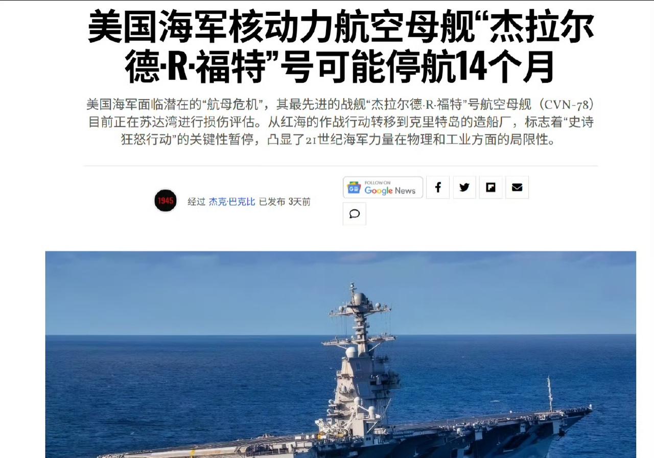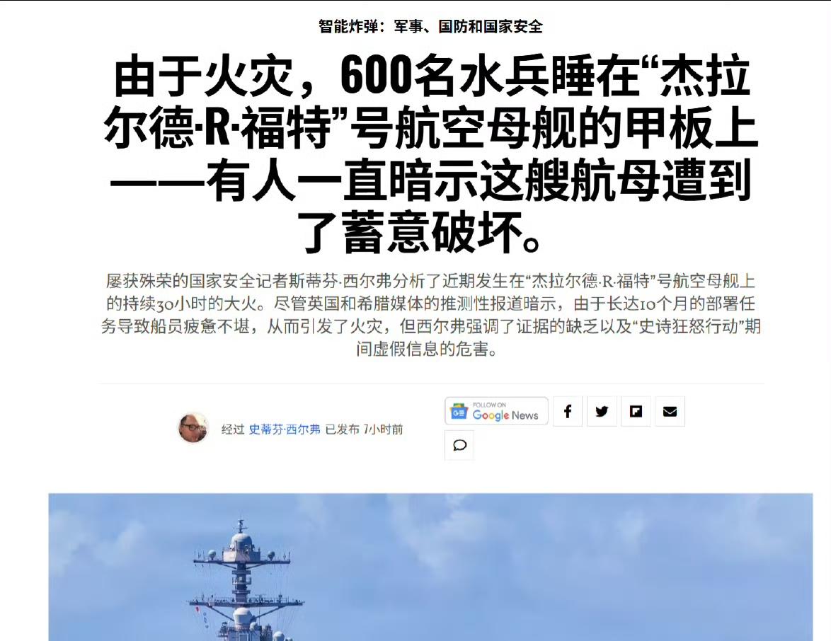 美军士兵厌倦打仗! 根据19fortyfive的报道,美军福特号航母因超期部署外加洗衣房火灾将停航12~14个月进行维修,同时承认许多来源暗示火灾可能是人为的蓄意破坏。 美军“福特”号航母因火灾受损严重,预计将停航维修 12 至 14 个月。该舰在超期部署期间发生洗衣房火灾,火势持续约 30 小时,导致大量生活设施烧毁,600 余名水兵被迫在甲板或地板上临时居住。关于火灾起因,虽然有部分来源和舆论推测可能是因士兵厌倦长期作战而进行的蓄意破坏,但目前官方调查尚未确认。 尽管有观点将火灾与士兵疲惫、厌战情绪联系起来,并暗示存在人为破坏可能。