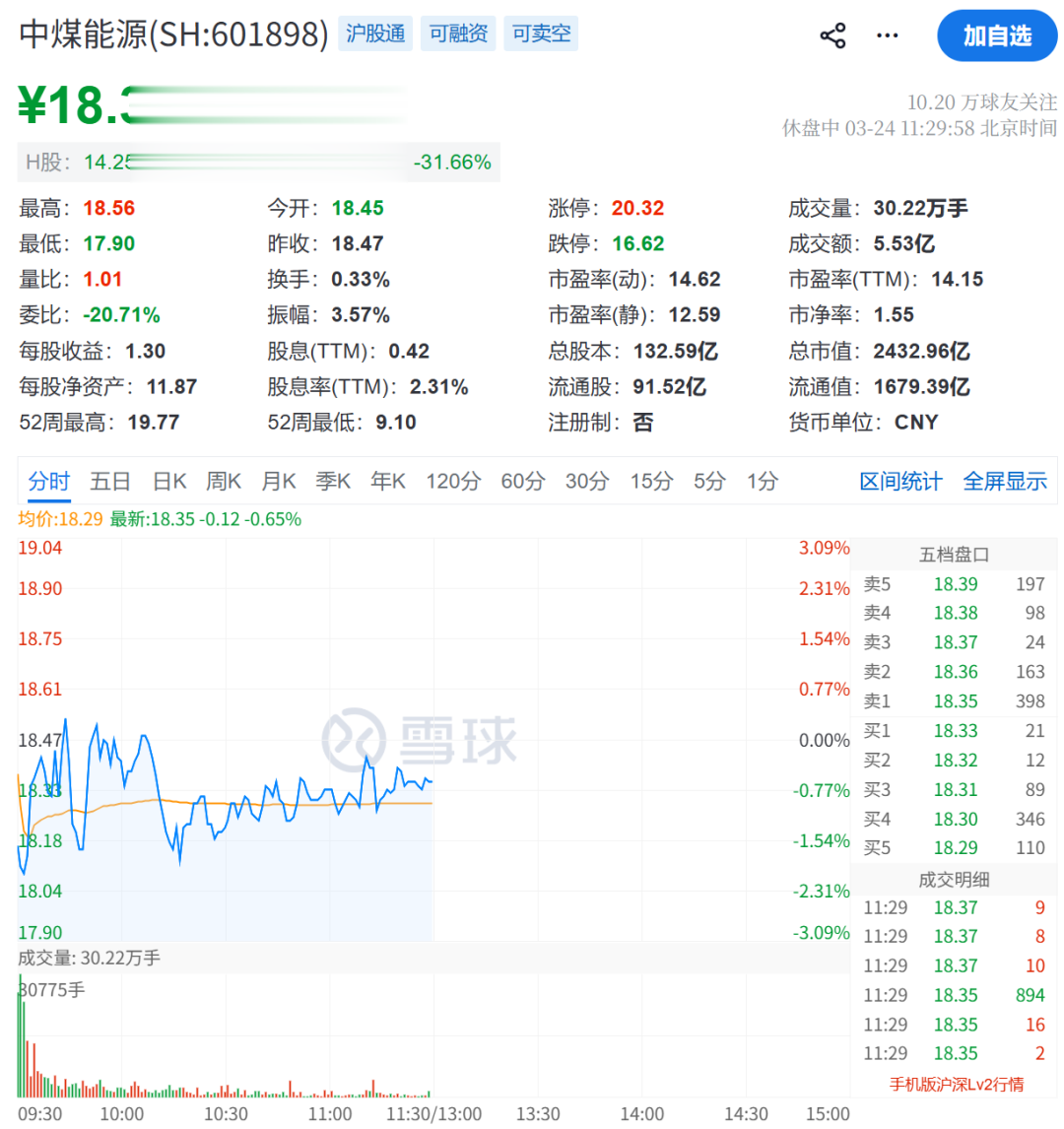 截至3月24日午间收盘,中煤能源A股股价为18.35元/股,总市值为2433亿元。