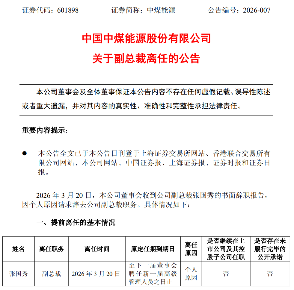 3月20日盘后,中煤能源发布公告称,董事会于当日收到公司副总裁张国秀的书面辞职报告,张国秀因个人原因请求辞去公司副总裁职务。