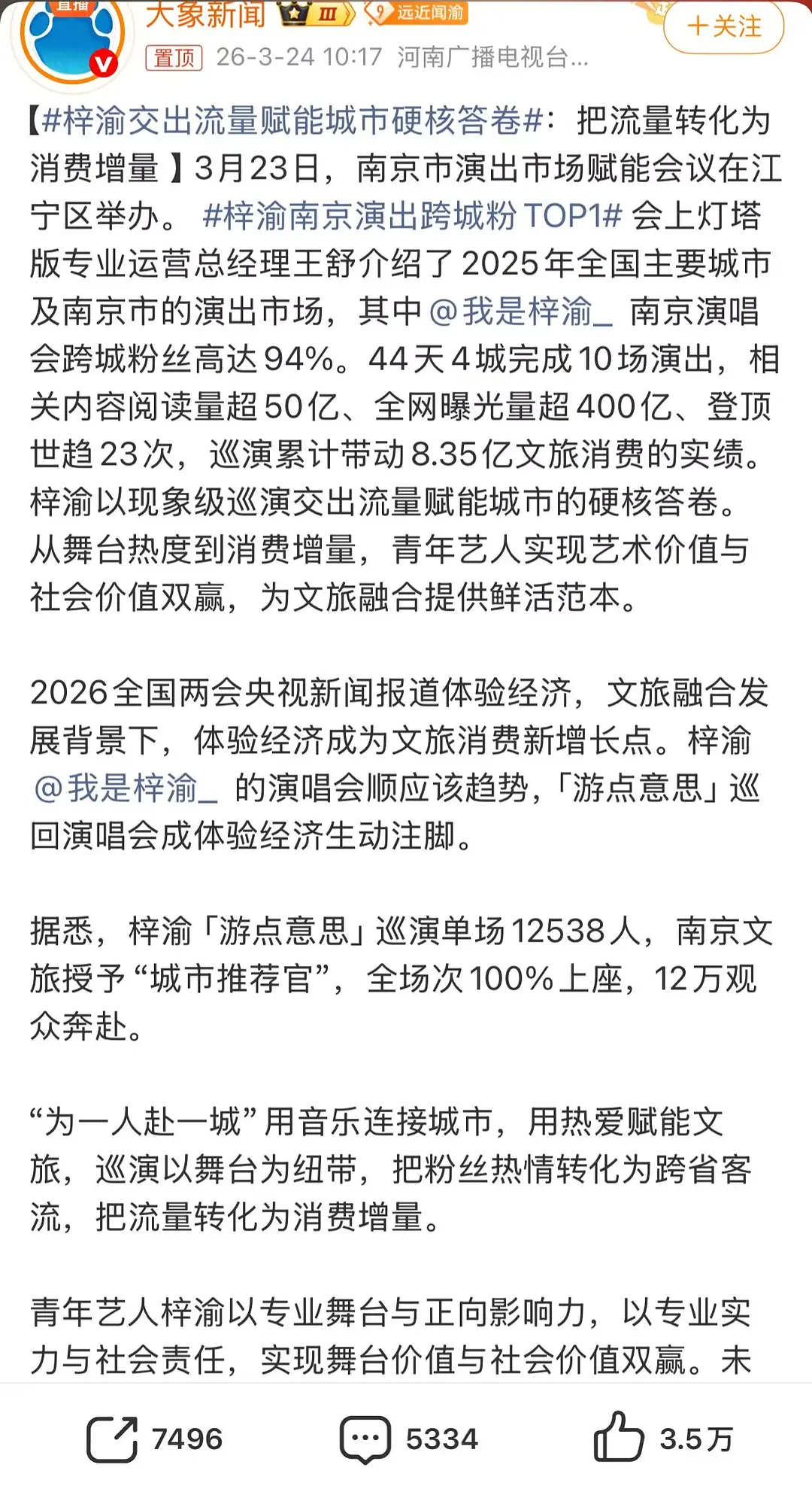 梓渝南京演唱会又被官方表扬了,南京文旅授予“城市推荐官”,南京演出跨城粉TOP1