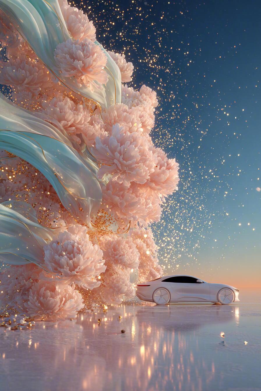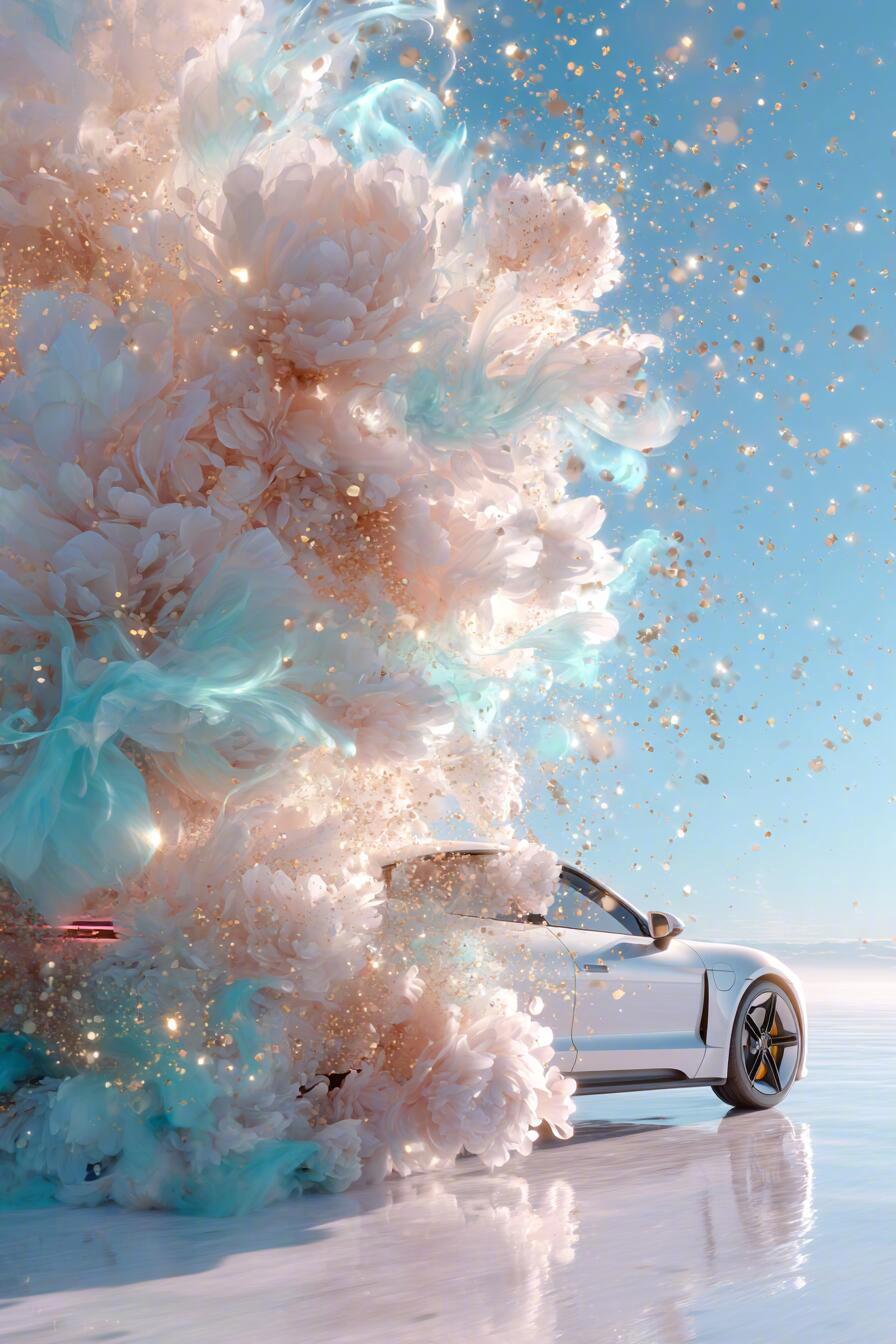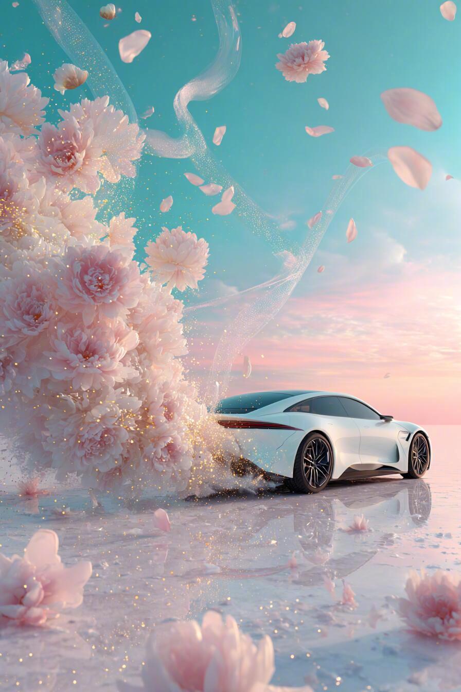 海报侧重展现汽车的流畅线条与澎湃动力。白色车身在清透的青绿色背景下显得格外纯净,车轮卷起的不仅仅是粉色牡丹(Pink peonies),更有无数颗粒分明的金粉(Gold sparkles)在空中跳跃。