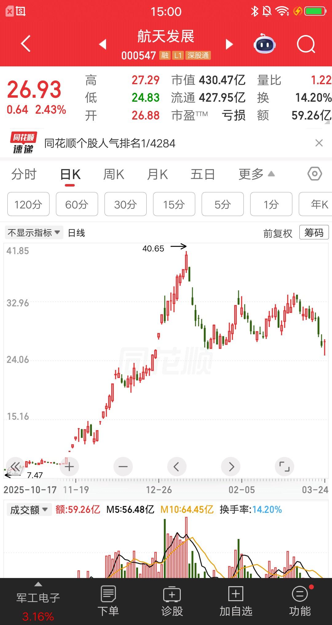 航天发展涨幅2.43%,热股榜冲到第一位了,热度超过1200万,是反弹还是反转呢?分时图看,在水下负5的位置,股价被直线拉升翻红。此后窄幅震荡,没有进一步上涨,也没有回落。在个股普遍反弹2到3个点的情况下,航天发展的涨幅并不明显。 日线看,在前期平台附近稳住,如果市场继续反弹,航天发展也会进一步走高。谨慎起见,要当做反弹看,逢高就卖。 对于高位股一定要慎重,每一次主跌浪都在告诉散户,赚钱没那么容易的。
