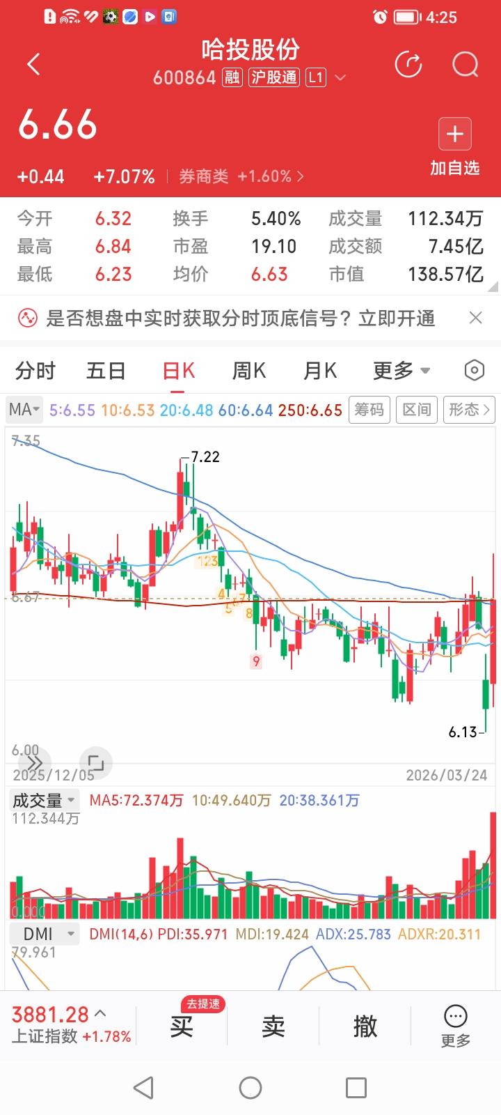 哈投股份,今天股价放量大涨7.07%,走势真带劲! 哈投股份,今天收盘价6.66元,股价一度触及6.84元的涨停价,形成了阳包阴的强势上涨走势,而且今天的最高价创出了近两个月的新高并且股价重新站上了年线。有点小牛犊子的感觉。 市场真的很聪明,哈投股份动态市盈率19倍左右,股价6元左右,总市值仅138亿元,属于估值低、股价低、流通市值低的三低股。很有群众基础。 哈投股份今天的强势上涨具有持续性吗?会形成燎原之势吗?关键还得看其业绩增长情况如何?
