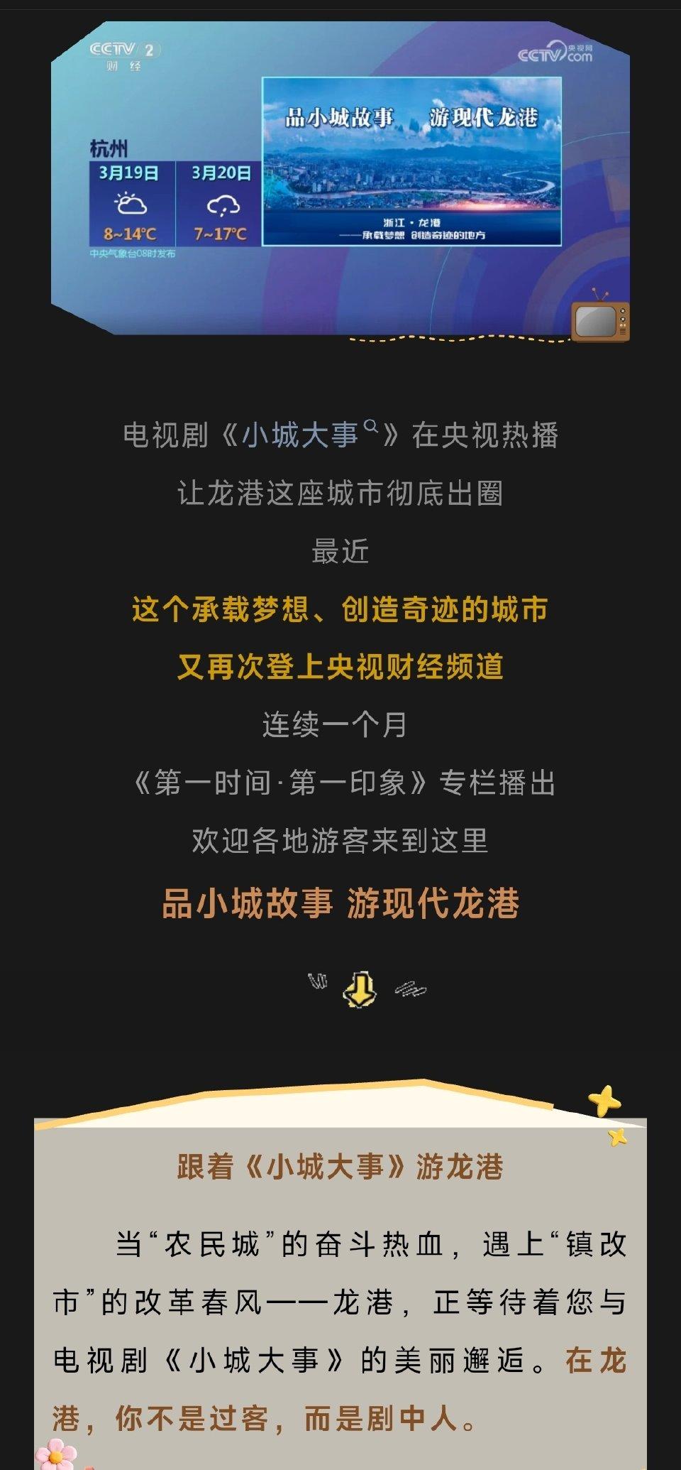 随着《小城大事》的热播,让龙港这个承载梦想、创造奇迹的城市彻底出圈![赞][赞][赞] 最近《小城大事》又再次登上央视财经频道,连续一个月在《第一时间•第一印象》专栏播出[击掌][击掌][击掌]