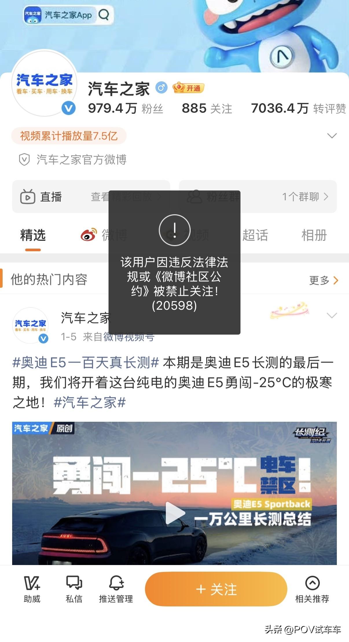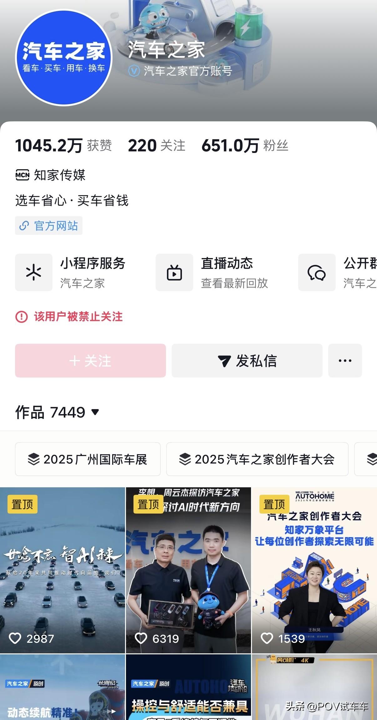 《汽车之家》被禁止关注了?! 我看了下微博和抖音上已经都不能关注了… 具体啥原因众说风云:今年一月份的“冬测”和“智驾横评”不规范?网上也揣测得罪了图三莫国产新能源? 以往都是封自媒体账号,这次是国内头部垂类汽车网站,这力度还是真没想到。 总之,给咱们做车评的人教训四个大字“谨言慎行”吧!为了流量和钱也好,为了站队也好;我个人对汽车之家还是有些情感的,也算是年轻时汽车爱好的启蒙网站。 汽车之家