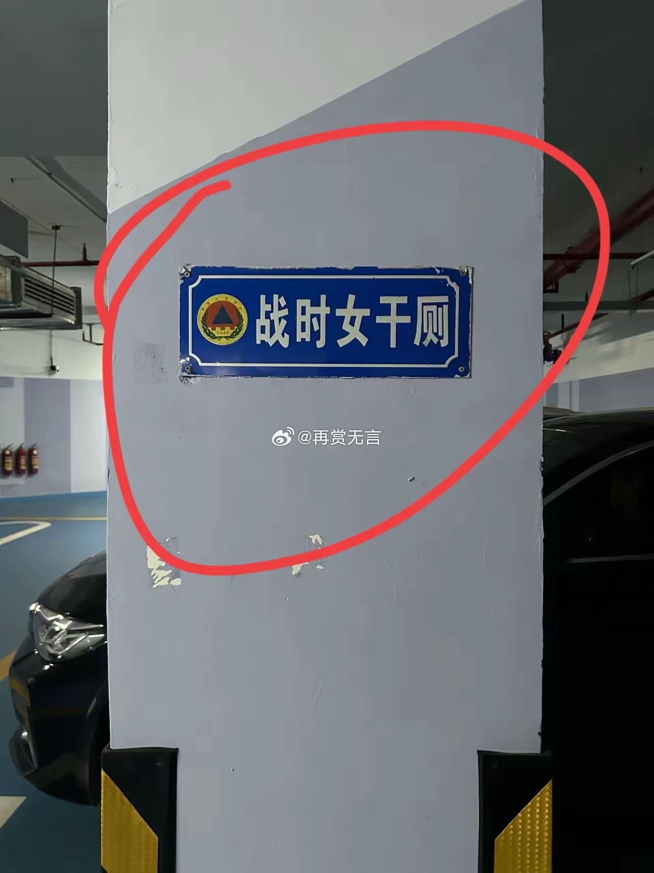 这个真是让我开眼了!逛过这么多商场的地下停车场,第一次见到贴这种标志的,上面写着“战时女干厕”和“战时男干厕”。有没有懂的朋友来解释一下,“干厕”到底是什么?