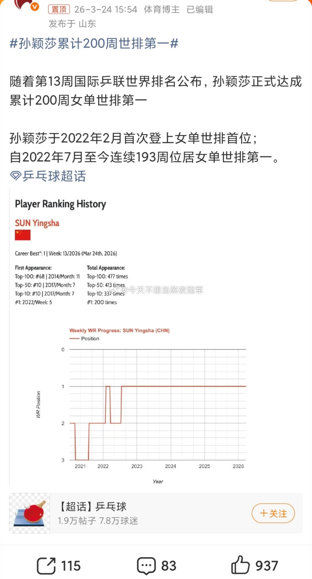 孙颖莎19岁第一次登顶,到现在200周稳坐第一