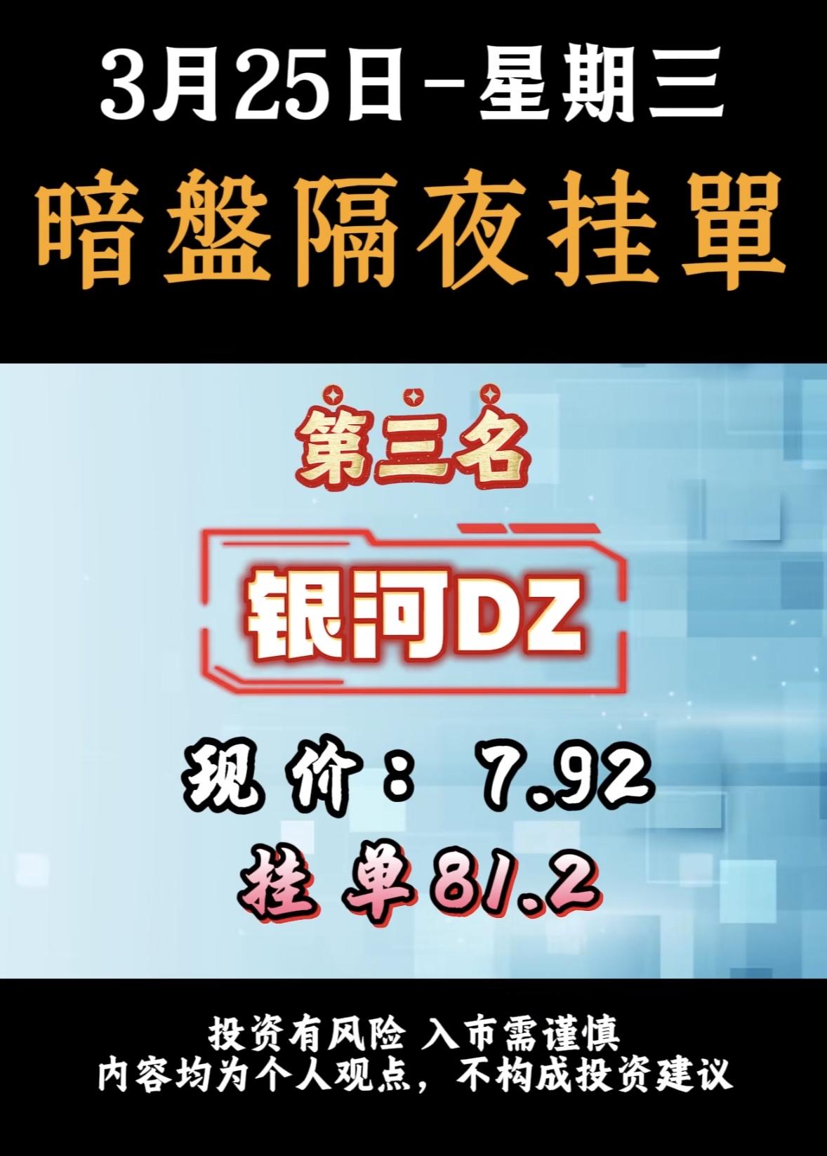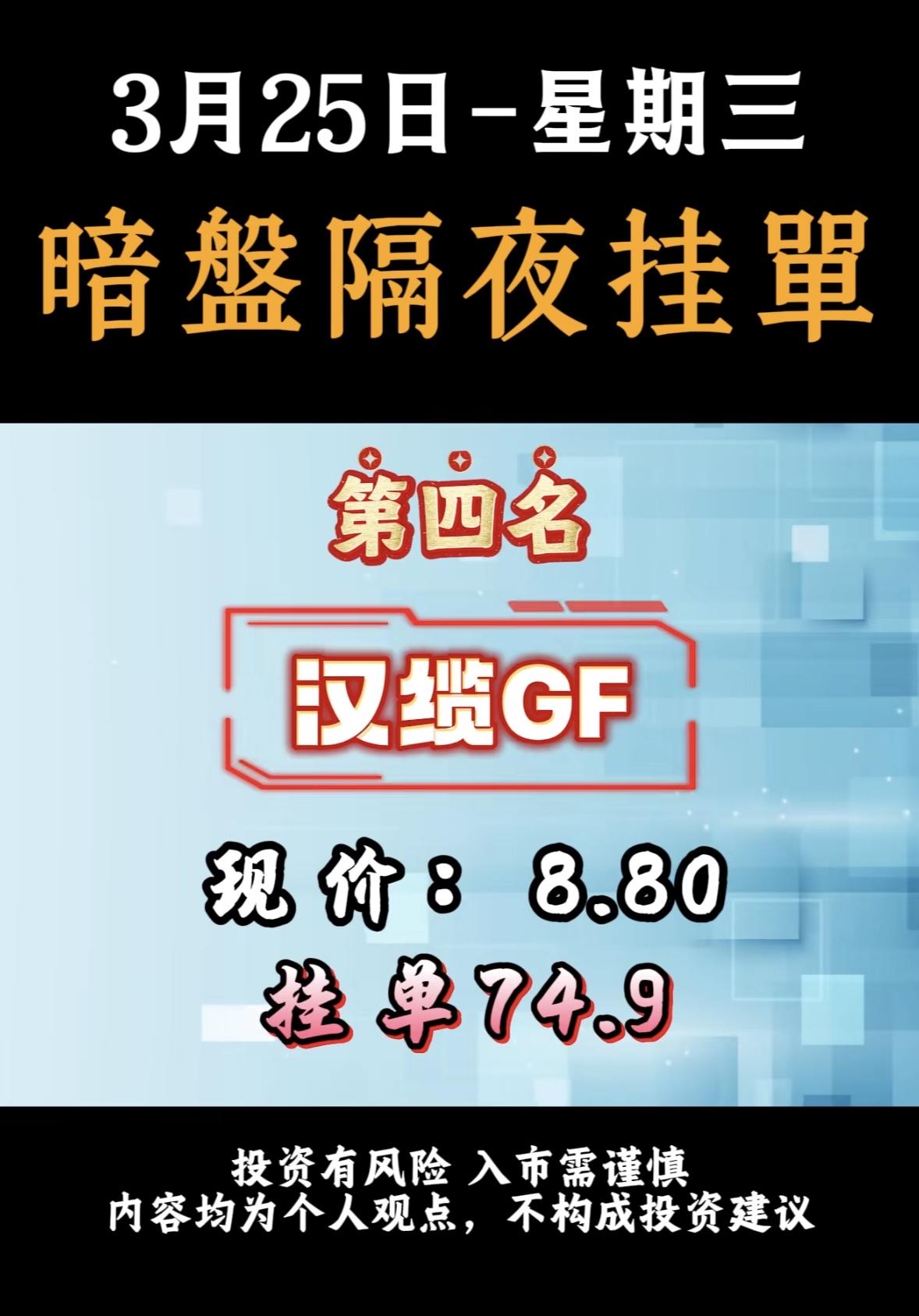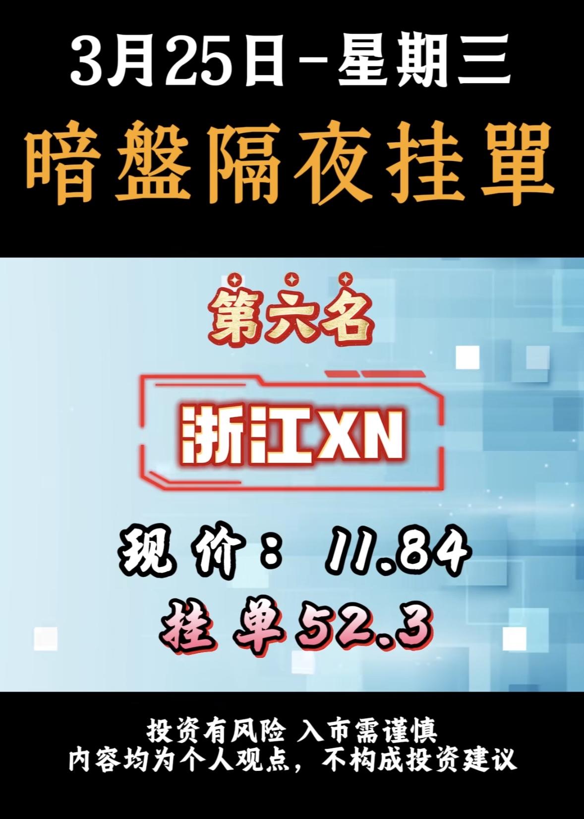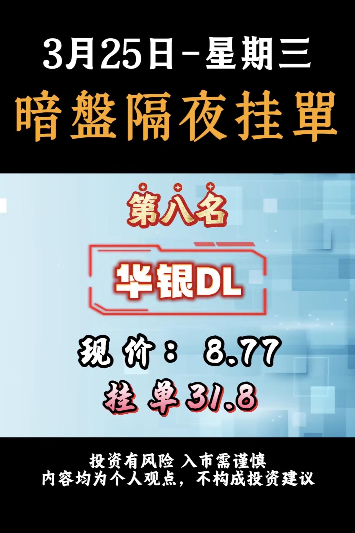 3月25日周三暗盘隔夜挂单排行榜揭晓 暗盘隔夜挂单这事儿还挺刺激的。就拿华银电力来说,现在股价是8.77,居然有人挂单31.8,这差距可不是一般的大。这就好比你去市场买菜,人家白菜卖1块钱一斤,你直接出价10块,这操作属实大胆。 不过投资这事儿,还真得谨慎。这种大幅度的挂单,风险和收益都像坐过山车一样。也许运气好,真能赚得盆满钵满,但要是行情不对,那可能就血本无归。所以啊,暗盘隔夜挂单虽然有机会,但也得掂量掂量自己能不能承受那风险,可别盲目跟风。