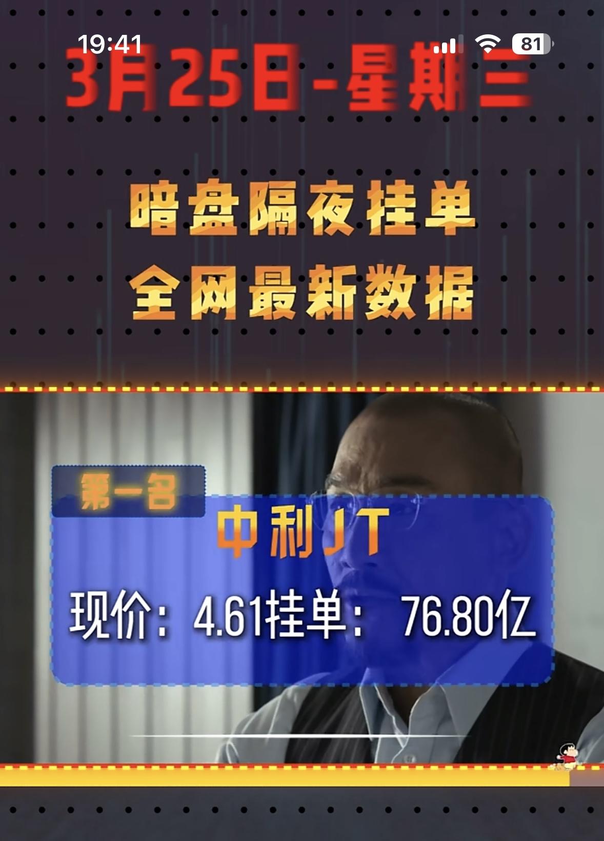 3月25日暗盘隔夜挂单排行榜出炉 最近中利集团在股市行情里简直杀疯了,强势领跑。现价4.61元,挂单76.80亿,这数据太炸裂! 它已经连收3个涨停板,连续涨停期间累计上涨33.24%。截至9:25,涨停板封单金额就有7.57亿元。从K线图看,开盘即封死涨停,买一位置堆着超100万手买单。技术指标也很亮眼,MACD红柱持续放大,KDJ三线在80上方强势发散。 中利集团拥有线缆、光伏两大主营业务,2025年前三季度归母净利润大幅减亏69.09%,年报预告也显示继续减亏。这到底是绿电龙头崛起,还是游资狂欢?值得持续关注。