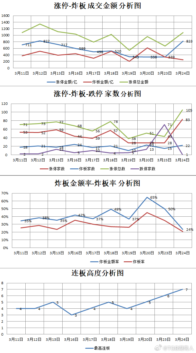 【3.24星期二】 湖南人涨停复盘 "涨停金额:823亿 炸板金额:255亿首板金额:759亿 连板金额:64亿涨停83家 炸板22家 跌停1家首板77家 连板6家" 【市场连板股】6只 64亿 代码 名称 末次时间 连板数 原因600396 华电辽能 10:03 7 电力002309 中利集团 9:25 3 光伏300385 雪浪环境 9:30 2 公告600758 辽宁能源 9:31 2 电力002218 拓日新能 9:33 2 光伏600032 浙江新能 14:48 2 光伏【电力】20只 314亿 消息面:“算电协同”首次写入政府工作报告;原油大涨引发能源危机 600396 华电辽能 10:03 7/13天8板 绿色电力+氢能600758 辽宁能源 9:31 2 热电600032 浙江新能 14:48 2 绿色电力+氢能000720 新能泰山 9:25 1 电力电缆002350 北京科锐 9:30 1 中标逆变器项目000722 湖南发展 9:34 1 绿色电力000509 华塑控股 9:45 1/3天2板 绿电(低浓度瓦斯发电)603421 鼎信通讯 9:56 1 智能电网002498 汉缆股份 10:21 1 特高压电缆000601 韶能股份 10:34 1/5天4板 设算电协同子公司300335 迪森股份 10:39 1 算电协同600744 华银电力 11:23 1 绿色电力600821 金开新能 13:31 1 算电协同600982 宁波能源 13:45 1 绿电601016 节能风电 13:52 1 绿电605196 华通线缆 14:29 1 电网设备002316 亚联发展 14:31 1 智能电网600868 梅雁吉祥 14:36 1 水力发电600192 长城电工 14:43 1 输变电设备000539 粤电力A 14:55 1/5天3板 电力【光伏】5只 29亿 消息面:特斯拉计划采购中国光伏设备 002309 中利集团 9:25 3 光伏组件002218 拓日新能 9:33 2 光伏储能603759 海天股份 9:25 1 与通威战略合作002323 雅博股份 9:37 1/8天4板 光伏600537 亿晶光电 14:14 1 钙钛矿电池【锂电池】8只 98亿 300497 富祥药业 9:51 1 业绩+锂电池电解液002192 融捷股份 10:35 1 拟投建锂电池项目603937 丽岛新材 13:59 1 电池集流体603527 众源新材 14:13 1 锂电池铜带002083 孚日股份 14:21 1 锂电池添加剂600773 西藏城投 14:31 1 碳酸锂000688 国城矿业 14:52 1 锂矿001203 大中矿业 14:56 1 锂矿【光通信】5只 117亿 消息面:美股光通信概念股大涨;国内厂商发布NPO新品 002491 通鼎互联 14:00 1 光纤002428 云南锗业 14:09 1/3天2板 磷化铟+光纤上游002222 福晶科技 14:18 1 法拉第旋光片+光通讯601869 长飞光纤 14:31 1 光纤涨价600184 光电股份 14:42 1 光纤【机器人】5只 19亿 消息面:上交所受理宇树科技IPO申请 603165 荣晟环保 9:39 1/3天2板 绿色电力+间接参股宇树301226 祥明智能 10:24 1 半导体洁净室+机器人002685 华东重机 11:19 1 控股GPU公司+机器人603922 金鸿顺 14:17 1 人形机器人605056 咸亨国际 14:48 1 机器人【算力】5只 42亿 消息面:我国日均Token调用量超过140万亿;阿里云、百度云AI算力和存储产品价格上调 600666 奥瑞德 10:22 1/5天3板 算力租赁002771 真视通 10:28 1 智能算力600186 莲花控股 10:41 1/4天2板 算力租赁603115 海星股份 10:41 1 AI服务器000811 冰轮环境 13:38 1 数据中心(液冷)【房地产】3只 3亿 消息面:房地产“控增量”引关注;上海市调整商业用房购房贷款最低首付款比例政策 002663 普邦股份 14:11 1 地产园林600510 黑牡丹 14:44 1 地产600234 科新发展 14:47 1 装修装饰【航天】3只 10亿 消息面:英伟达发布"太空计算"平台 603017 中衡设计 10:32 1 商业航天600076 康欣新材 13:05 1 拟收购宇邦半导体002519 银河电子 13:39 1 参股格思航天【军工】3只 16亿 601606 长城军工 9:53 1 弹药武器装备600698 湖南天雁 10:03 1 军用涡轮增压器002265 建设工业 10:22 1 军工【氢能】3只 12亿 688551 科威尔 9:36 1 制氢电解槽601226 华电科工 9:39 1 氢能600475 华光环能 11:03 1 氢能装备【其他热点】 600137 浪莎股份 13:40 1 大消费603808 歌力思 14:24 1 大消费601975 招商南油 13:24 1 航运600026 中远海能 15:00 1 航运605299 舒华体育 13:15 1/3天2板 体育产业002887 绿茵生态 13:16 1 体育产业603538 美诺华 9:40 1/3天2板 医疗医药+益生菌002082 万邦德 11:14 1 医疗医药【其他个股】 300385 雪浪环境 9:30 2 签署重整投资协议002445 中南文化 9:46 1/12天7板 拟购买苏龙热电600539 狮头股份 9:52 1 拟收购603929 亚翔集成 9:52 1/8天4板 国产芯片601858 中国科传 10:10 1 出版传媒002795 永和智控 10:26 1 光伏资产剥离000677 恒天海龙 10:35 1/3天2板 多弗航空资产待注入000065 北方国际 10:45 1 大基建000035 中国天楹 10:50 1 甲醇000415 渤海租赁 13:02 1 大金融600527 江南高纤 13:41 1 化纤002645 华宏科技 13:54 1 稀土磁材002631 德尔未来 14:14 1 石墨烯605366 宏柏新材 14:17 1 石油化工002636 金安国纪 14:40 1 PCB板【涨停炸板】22只 255亿 代码 名称 首次时间 涨跌幅 原因688519 南亚新材 14:50 18.03% PCB板301183 东田微 14:24 16.46% 光通信000537 绿发电力 14:49 10.04% 智能电网000809 和展能源 9:33 9.86% 其他603716 塞力医疗 9:55 9.20% 脑科学000531 穗恒运A 11:05 9.14% 智能电网000516 国际医学 9:55 8.91% 医疗医药002654 万润科技 14:35 8.47% 内存603738 泰晶科技 9:31 7.86% 光通信603577 汇金通 9:38 7.62% 智能电网002025 航天电器 14:45 6.99% 航天001396 誉帆科技 14:15 6.98% 其他600645 中源协和 9:58 6.77% 医疗医药001258 立新能源 9:40 6.69% 电力600545 卓郎智能 9:38 6.50% 算力603669 灵康药业 13:03 6.17% 医药000815 美利云 10:10 5.98% 云计算数据中心603324 盛剑科技 13:57 5.91% 国产芯片603520 司太立 10:24 5.03% 医药603272 联翔股份 9:30 5.00% 股权转让002339 积成电子 9:31 4.08% 智能电网603787 新日股份 9:30 2.90% 美伊战争