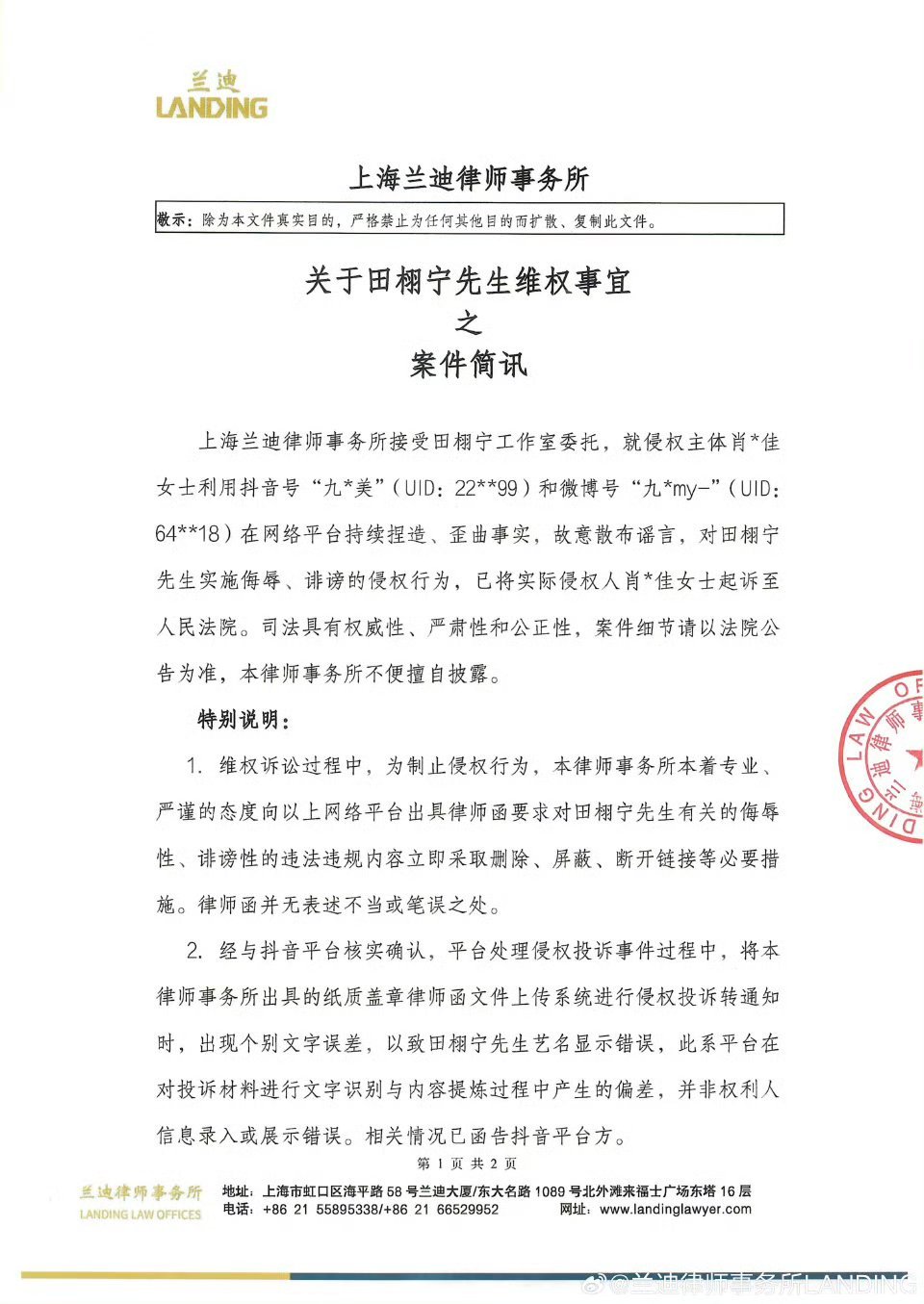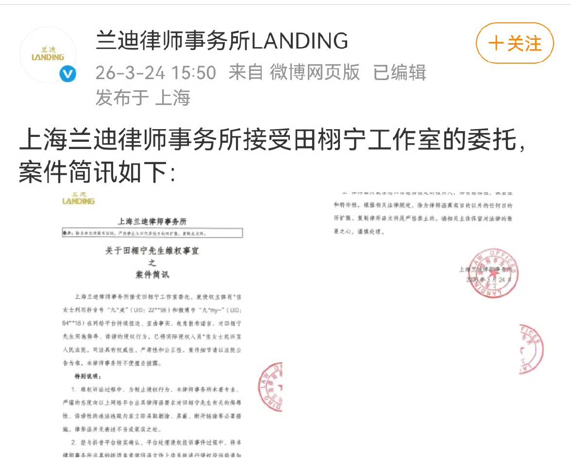 田栩宁起诉九成美案件简讯田栩宁起诉九成美后续 律师事务所发了田栩宁起诉九成美案件简讯,已将九成美起诉至人民法院了