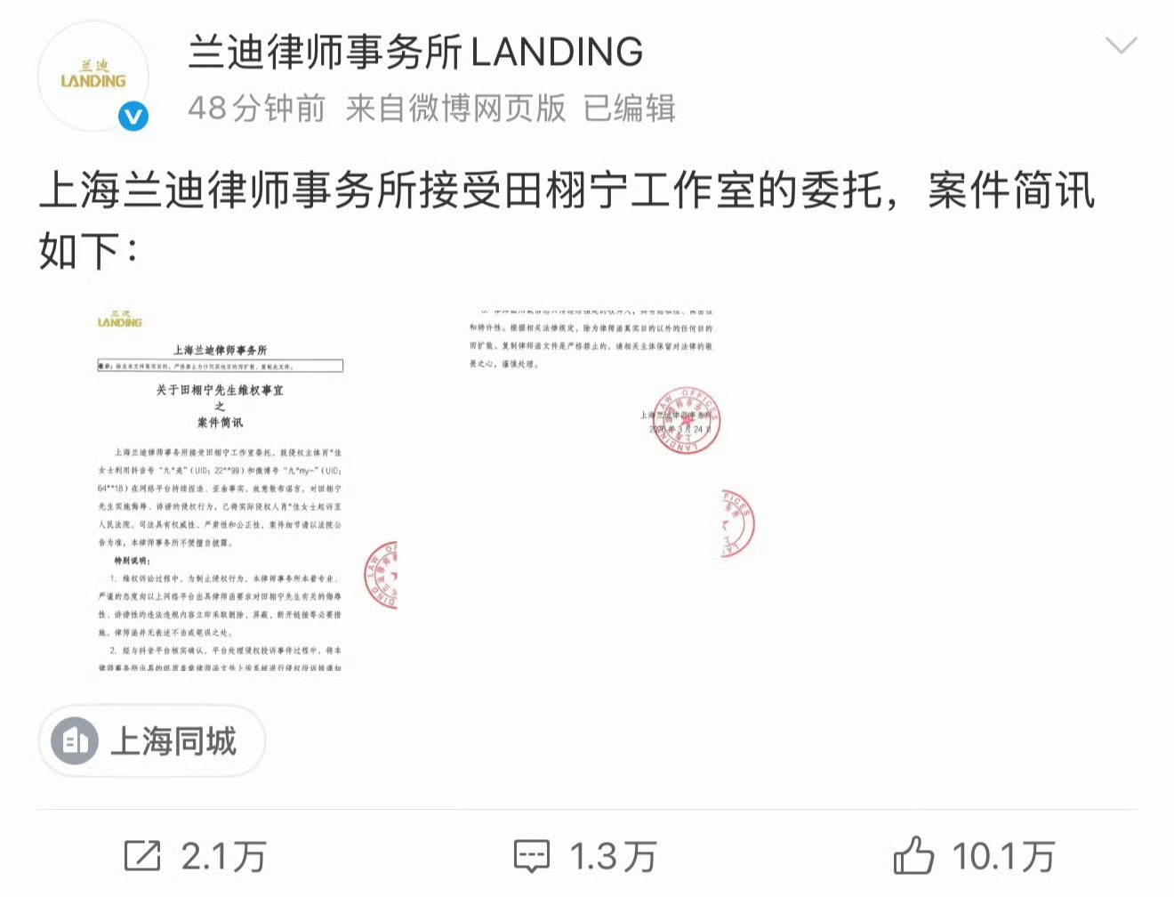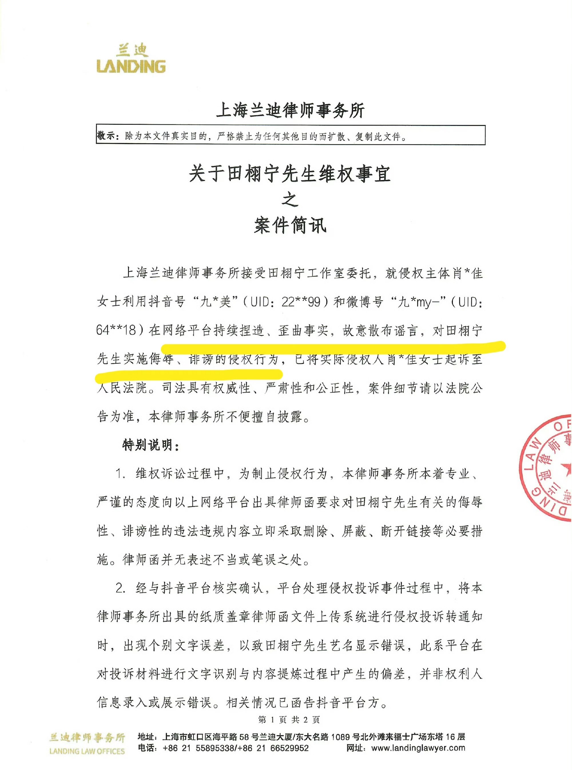 田栩宁相关维权事件迎来新进展网络空间从来都不是法外之地坚定支持合法维权期待公正严明的处理结果!律所发布田栩宁维权案件简讯
