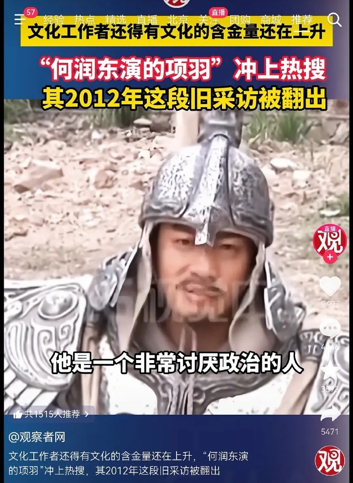 观察者评何润东的项羽:“文化工作者还得有文化的含金量还在上升”,这在掀桌张凌赫吧