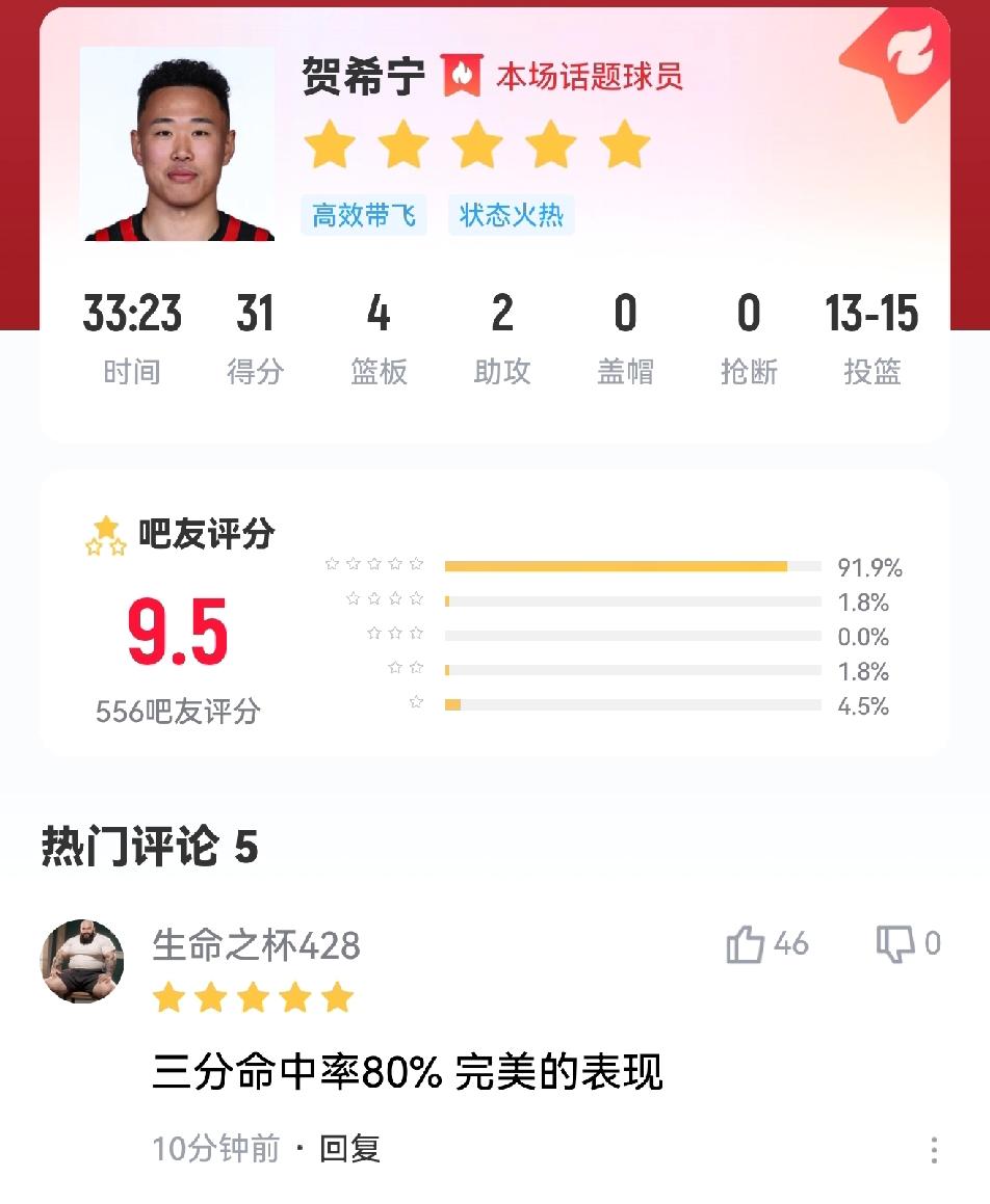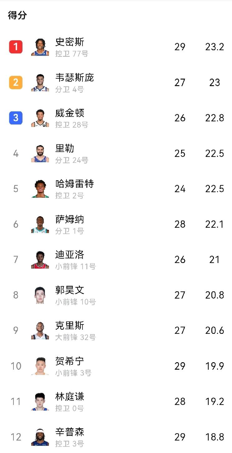 深圳现在真的很强大!刚刚,深圳以104-84大胜江苏,贺希宁31+4+2,阿利兹20+6,约翰逊13+2+6,史密斯13+2+6,王浩然10+2+3,特别是贺希宁,真是太让人放心了,15投13中,投篮命中率高达86.7%,非常恐怖! 本赛季,贺希宁场均得分19.9分,排在联盟第10,前十中,只有两位国内球员,除了贺希宁外,还有郭昊文(20.8分)! 深圳队还有一个场均得分第一的史密斯(23.2分),排25位的王浩然(15.9分),以及11.4分约翰逊,要说本赛季谁还能与上海抗衡,深圳算是最大的那三两个队之一!