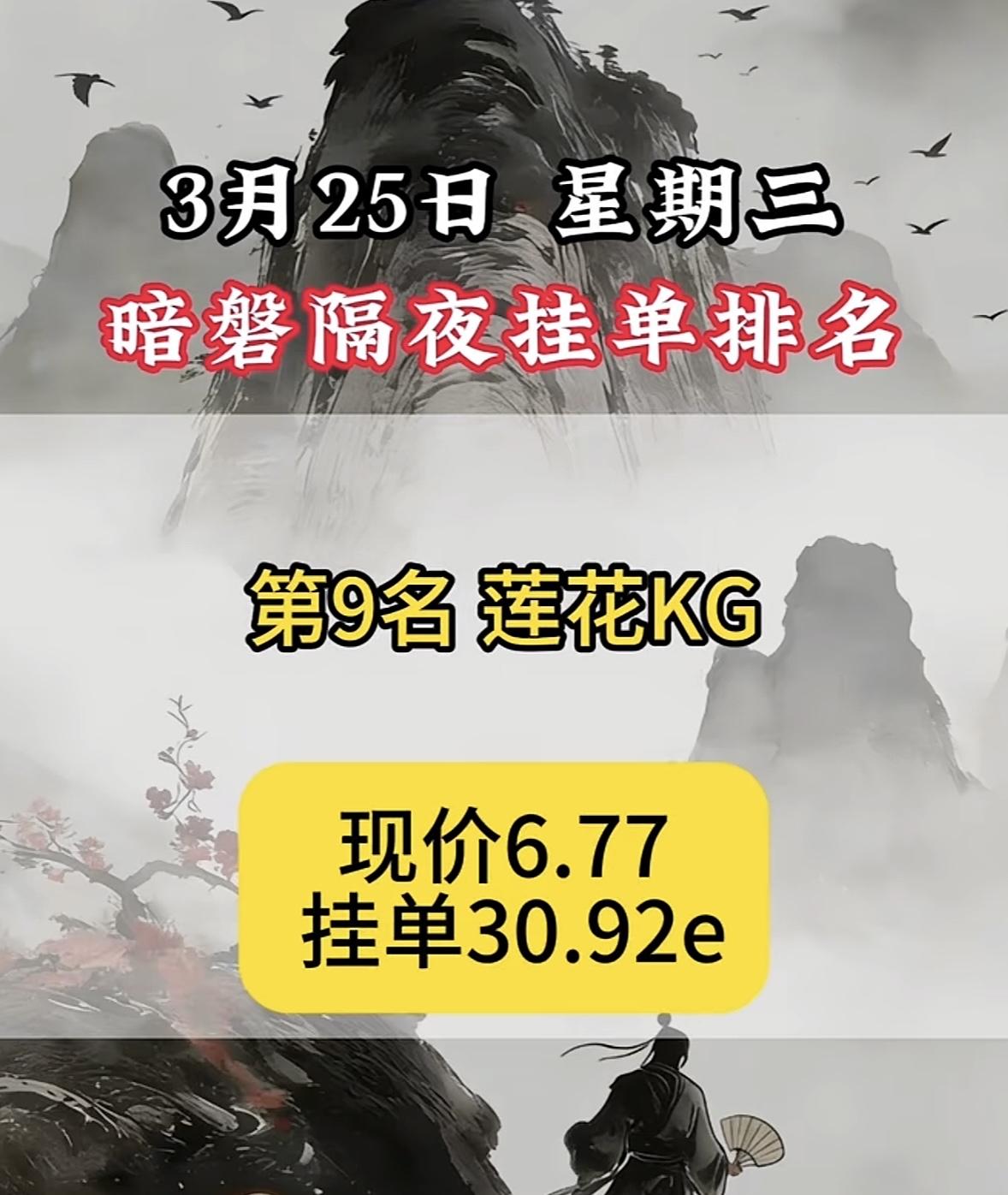 3月25日暗盘隔夜挂单排名揭晓 莲花控股排第9,现价6.77,挂单30.92e。这数据一出来,肯定吸引不少股民目光。 从个股分析看,莲花控股综合增持评分62,打败了88%的股票。不过目前处于空头行情,反弹趋势减缓,资金还呈流出状态。近5日资金流出8950.17万元,远低于行业平均水平。当日它跌了3.48%,成交额5.56亿元,主力轻度控盘。虽说公司运营状况良好,但长期投资价值一般。还有它涉及DeepSeek概念等多个热门概念,未来走势挺值得关注,是机会还是风险,就看市场怎么发展了。