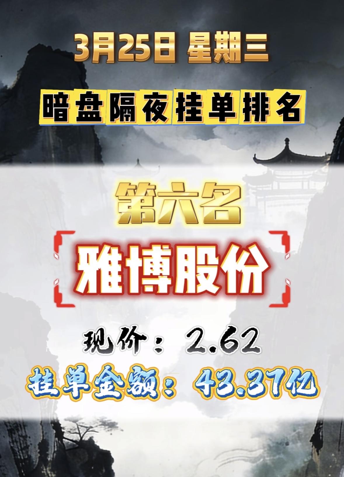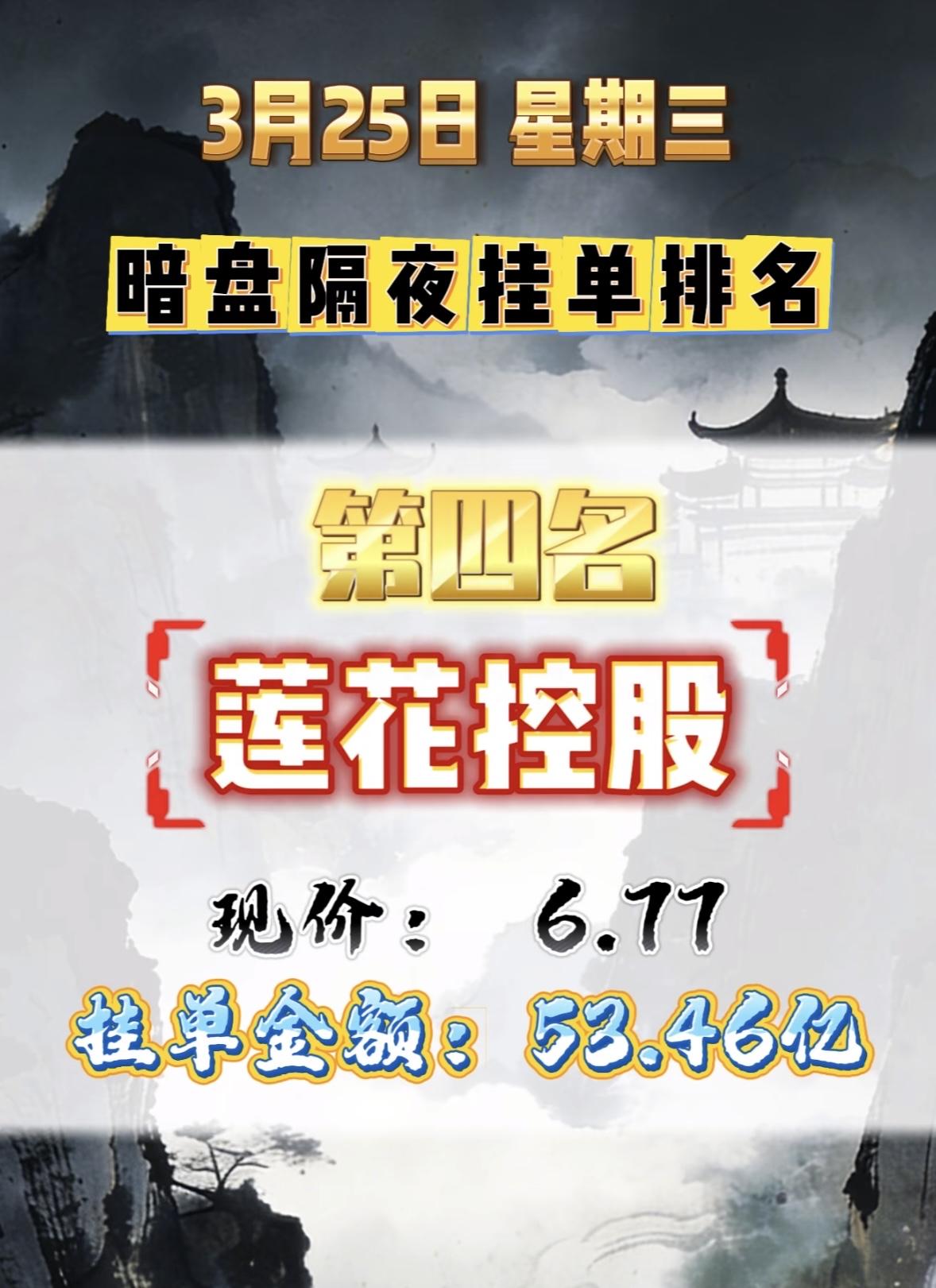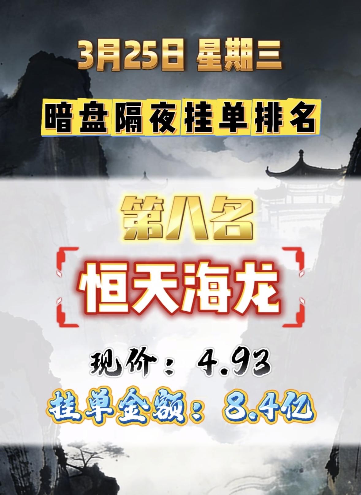 3月25日暗盘隔夜挂单排行榜出炉 恒天海龙这波在暗盘隔夜挂单排名里可太猛了!现价4.93,挂单金额竟高达8.4亿,直接强势上榜。这就好比一场激烈的战斗,恒天海龙带着巨额“兵力”冲锋在前。这么高的挂单金额,说明有不少投资者看好它后续的表现。也许是公司有潜在的利好消息,或者是行业前景被大家普遍认可。在股票市场里,这样的巨额挂单就像一颗信号弹,吸引着众多目光。不知道后续它会如何发展,是一路高歌猛进,还是会有其他变数,值得持续关注。