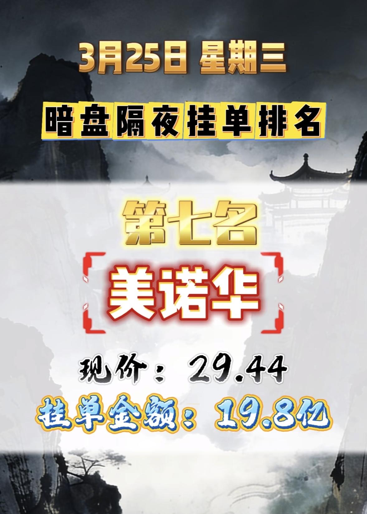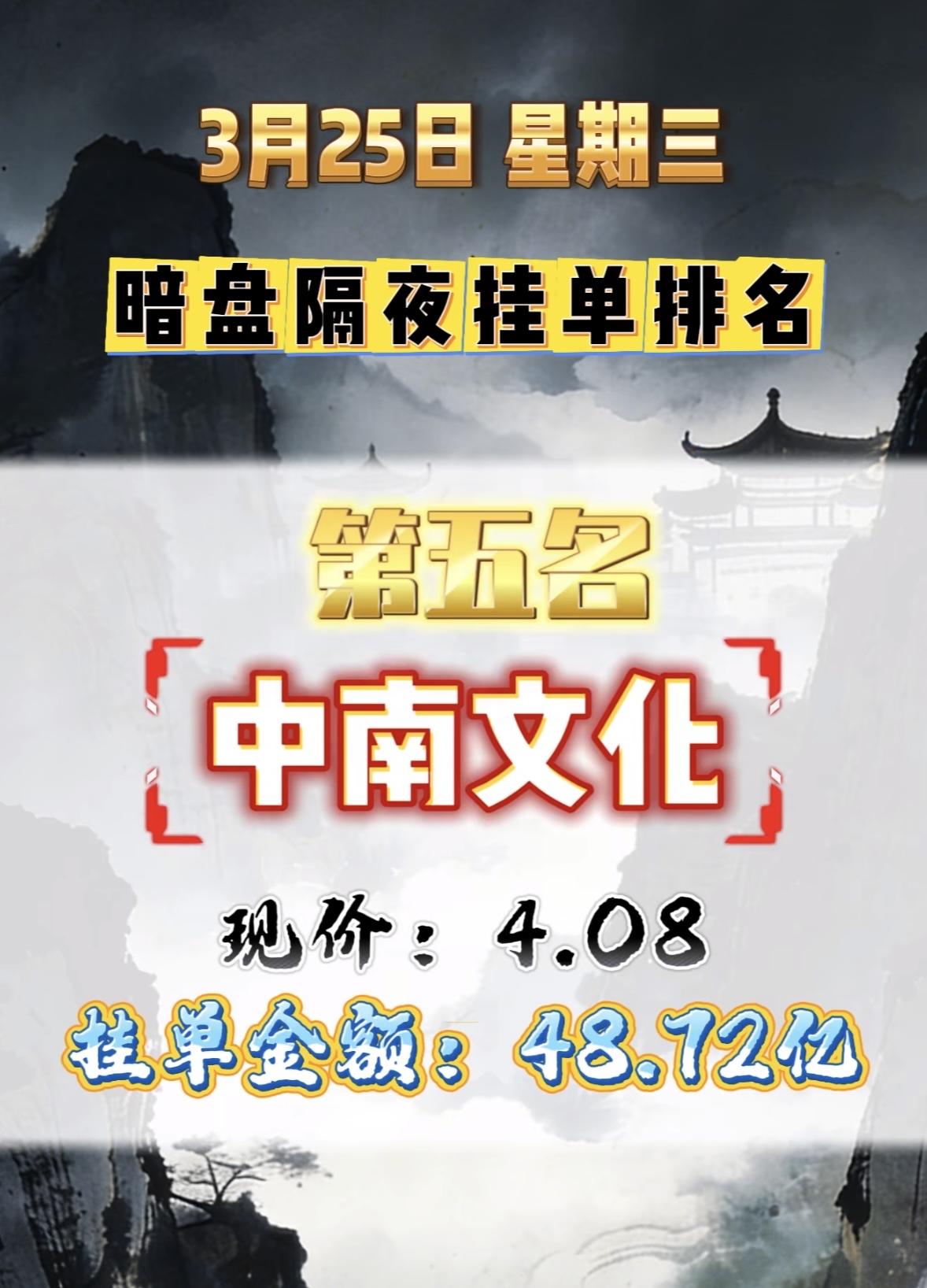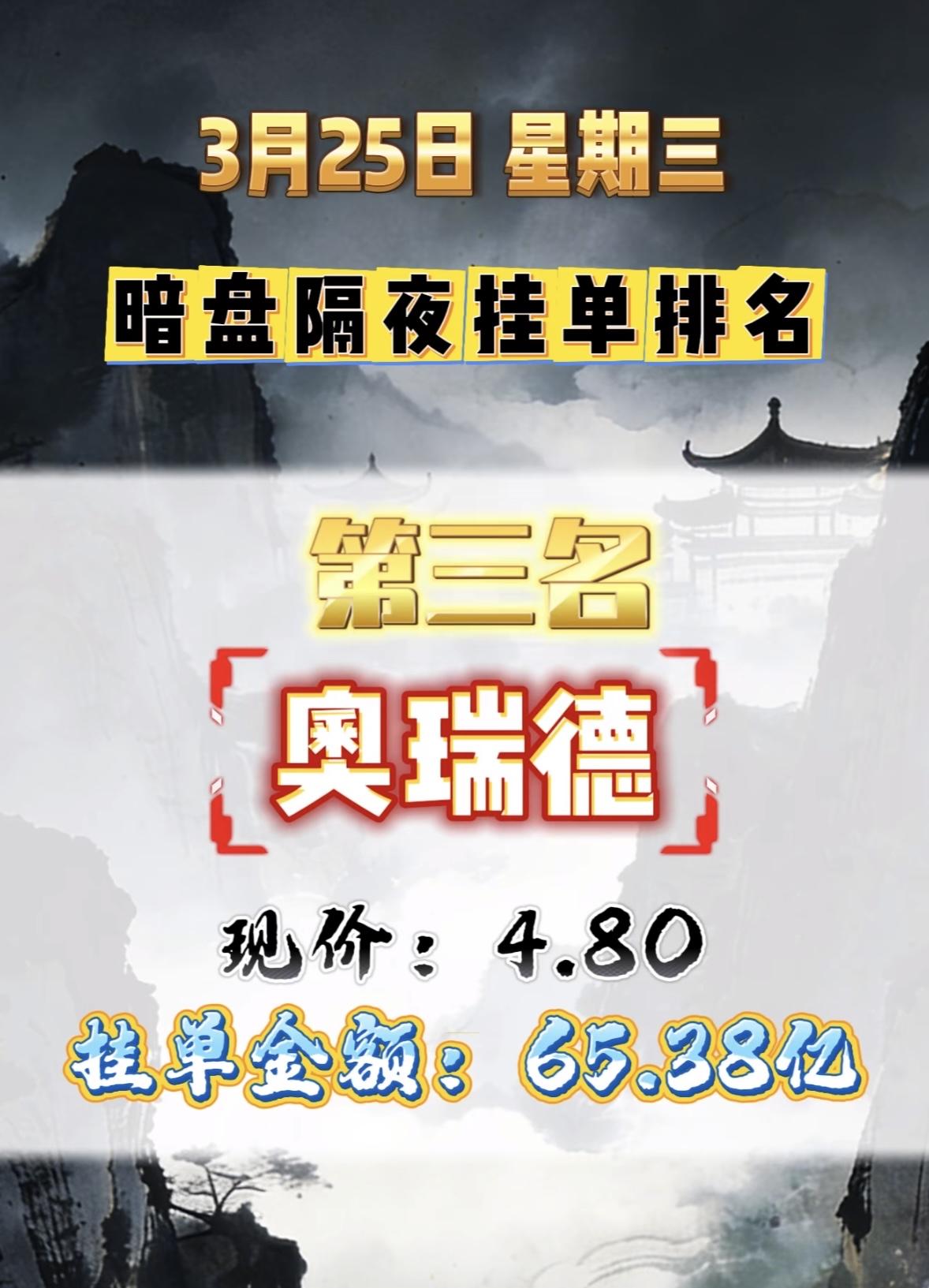 3月25日暗盘隔夜挂单排行榜出炉 恒天海龙这波在暗盘隔夜挂单排名里可太猛了!现价4.93,挂单金额竟高达8.4亿,直接强势上榜。这就好比一场激烈的战斗,恒天海龙带着巨额“兵力”冲锋在前。这么高的挂单金额,说明有不少投资者看好它后续的表现。也许是公司有潜在的利好消息,或者是行业前景被大家普遍认可。在股票市场里,这样的巨额挂单就像一颗信号弹,吸引着众多目光。不知道后续它会如何发展,是一路高歌猛进,还是会有其他变数,值得持续关注。