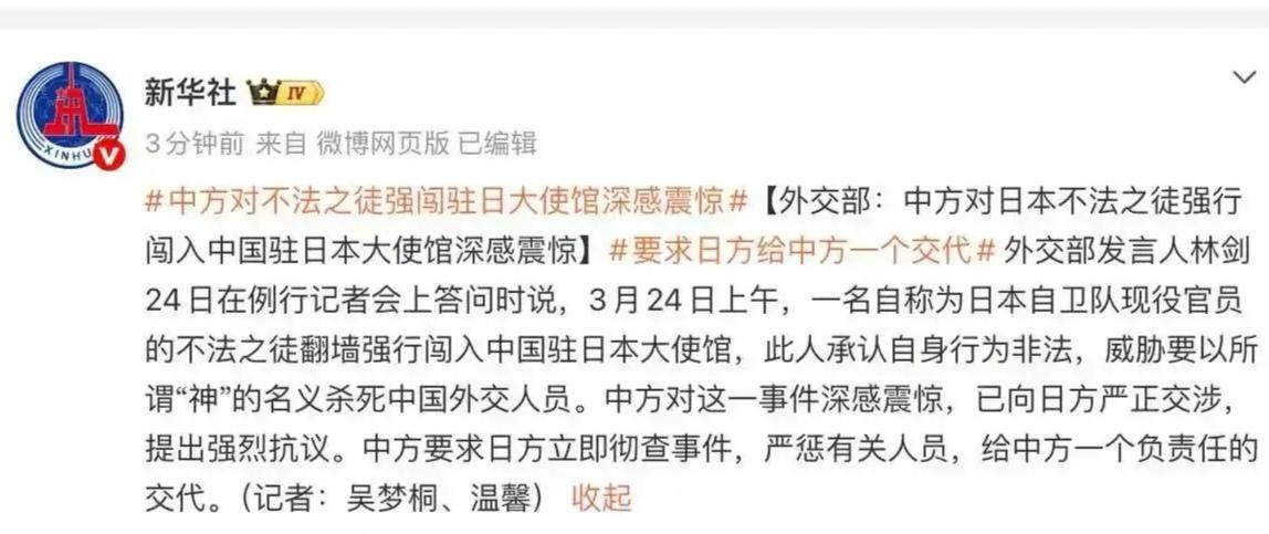 震怒与警惕!一日本自卫队现役官员翻墙闯入我大使馆威胁杀人惹众怒,有人又联想到“9.18”和“7.7”事变! 据多家媒体报道,就在3月24日上午,一名自称为日本自卫队现役官员的不法之徒,翻墙强行闯入中国驻日本大使馆,此人承认自身行为非法,威胁要以所谓神的名义杀死中国外交人员。 此事发生后,迅速引发众怒,有人在对强行闯入我驻日使馆的日本人进行谴责后认为,种种迹象表明,这明显是一起有组织有预谋的对我驻日外交人员进行大肆威胁的行为。 从事件的表面上看,是一位日本人强行擅闯我驻日大使馆的威胁行为,可实际上在其背后,一定有多人协同配合,甚至不排除在其背后的始作俑者,还有日本当局的相关人员暗中助力。 对此,有人甚至又联想到“9.18”和“7.7”事变,认为当下一些日本人妄想复辟军国主义,而这些新生的军国主义者和他们的老军国主义者一样,什么卑鄙和下三滥的事都可以做出来的。 因此,有网友呼吁,从某种程度上来说,在当前的日本国内,极右翼军国主义思想和势力已经十猖獗,这一事件值得我们国人高度警惕。 而有人则认为,可以说,这一事件既是以美国为首的西方国家为谋求地缘政治私利,纵容包庇日本军国主义的恶果,更是当前日本国内政治势力集体向极右翼右转推行的军国主义路线带来的直接结果。 这正如中国外交部发言人林剑所说的那样,这一事件再次反映出日本国内极右翼思潮和势力十分猖獗,也暴露出日本政府在历史、台湾等涉及中日关系重大核心问题上的错误政策,流毒深重。 日方对自卫队人员失管失教,未能履行对中国使领馆和外交人员的安保责任。国际社会应高度警惕日本国内加速右倾化和自卫队扩军失管的危险动向。 因此,我们必须众志成城,万众一心,临危不惧,居安思危,对日本极右势力妄想复辟军国主义的梦想保持高度警惕。