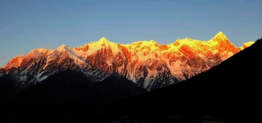 日照金山 三季云雾闷, 一朝露金身。 囿于苍翠冷, 熔炉炼凡尘。 (神圣的雪山,一年三季看不见。一季当中,最美数日照金山。南迦巴瓦峰,或许未来能亲见。只叹人生何其短,人间风景难尽览。)