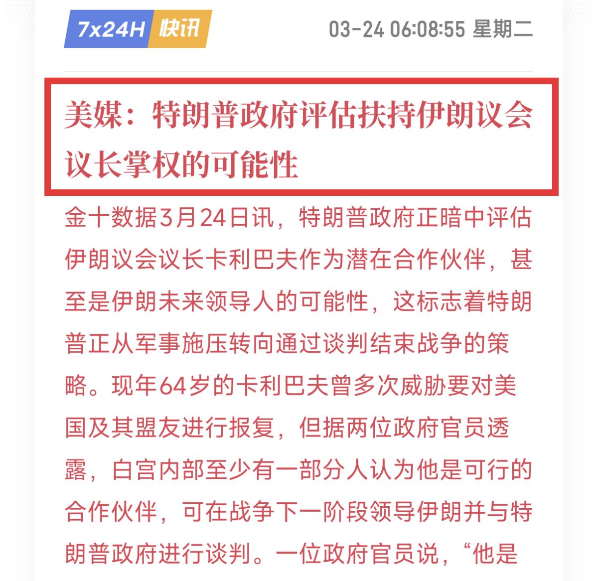 好家伙,懂王又画上k线了! 就在昨天他发那篇Taco贴之前15分钟,至少有600万桶布伦特和WTI原油期货合约,遭到集中抛售,相当于日均成交量的90%。 每天成交量的90%,发文前15分钟,精准卖出,你说这玩意怎么玩? 为了给美股和美债护盘,压低油价,他还相继使出了反间计、暗度陈仓计、偷梁换柱计、瞒天过海计…… 据美媒报道:懂王企图扶植伊朗议长卡利巴夫,成为伊朗未来的领导人,并通过与他谈判,来达成一份所谓的“停战协议”,然后胜利撤兵。 但卡利巴夫明确否认:从未与美国谈判,这是用于操纵金融和石油市场的“假消息”,试图在伊朗内部制造“政治和社会分裂”。 伊朗官媒也指出:所谓伊朗议长与美国的谈判,完全是假消息,其目的之一是为暗杀卡利巴夫创造条件。 伊朗不愧为文明古国,看得明明白白的。 目前中东的症结在于:伊朗只能自保,但无力反杀美国;而美国具备掀桌子的实力,却无法承担掀桌子的后果。 今天股市、黄金的反弹,完全托懂王Taco帖和烟雾弹的福,大家也终于回了一口血,就是不知道还能撑多久。 反正情况,就是这么个情况:中东不稳,油价下不来,万物不稳,其他地区也暗流涌动。 所以千万不要瞎追高,可以做做波动,稳住别浪。