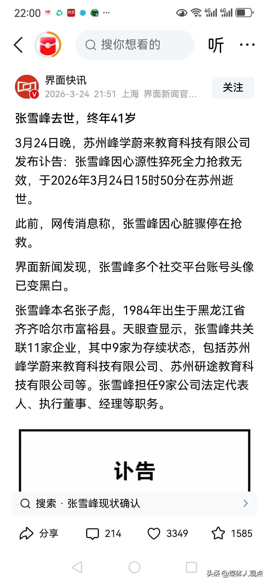 有关于知名教育博主张雪峰去世的事儿已尘埃落定,确实去世了,请看截图里的官媒的报道! 今天是3月24日,一个小时以前看了不少官媒关于网上传言说张雪峰心脏骤停,不少官媒采访了他的合作人都说是无可奉告,还采访一个合作人说是在成都还是哪里出差,对此事不知情。随后我就看到了一个自媒体发的视频,是个女的配音的这么个视频,说关于张雪峰心脏骤停纯属是谣言,说是哪个部门回复了是假的,哎,直到看到截图里的官媒报道才知道,张雪峰确实是去世了,这下不用再猜了!天堂里没有疾病,雪峰一路走好!
