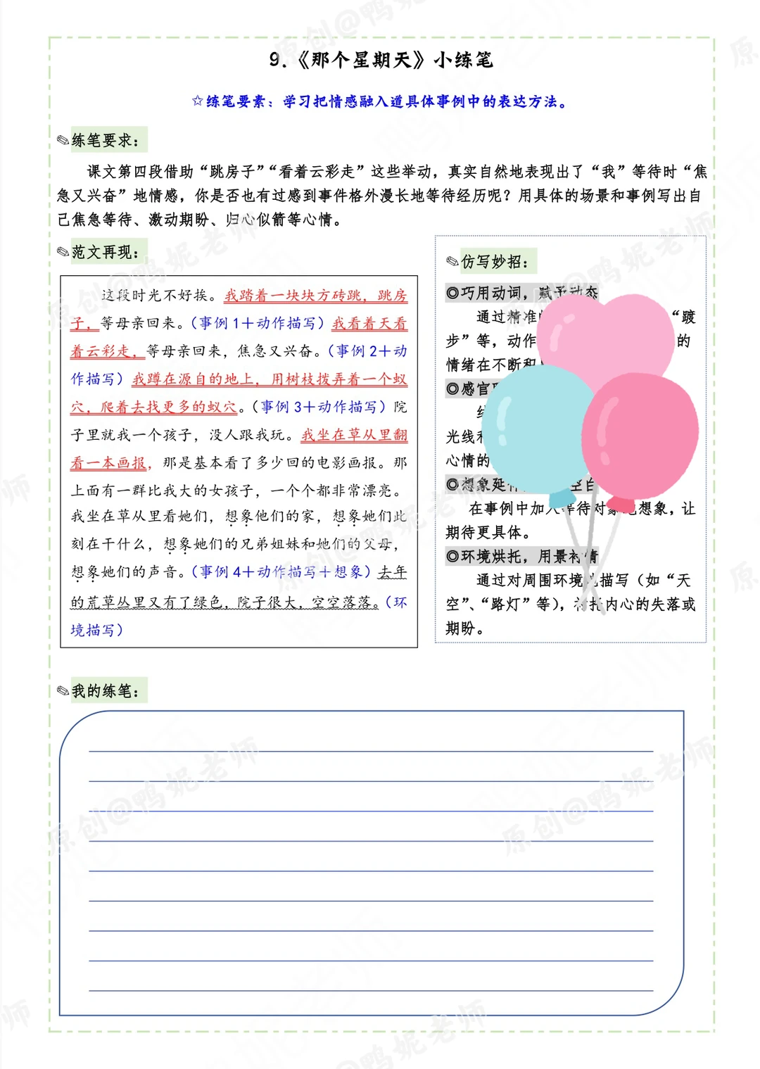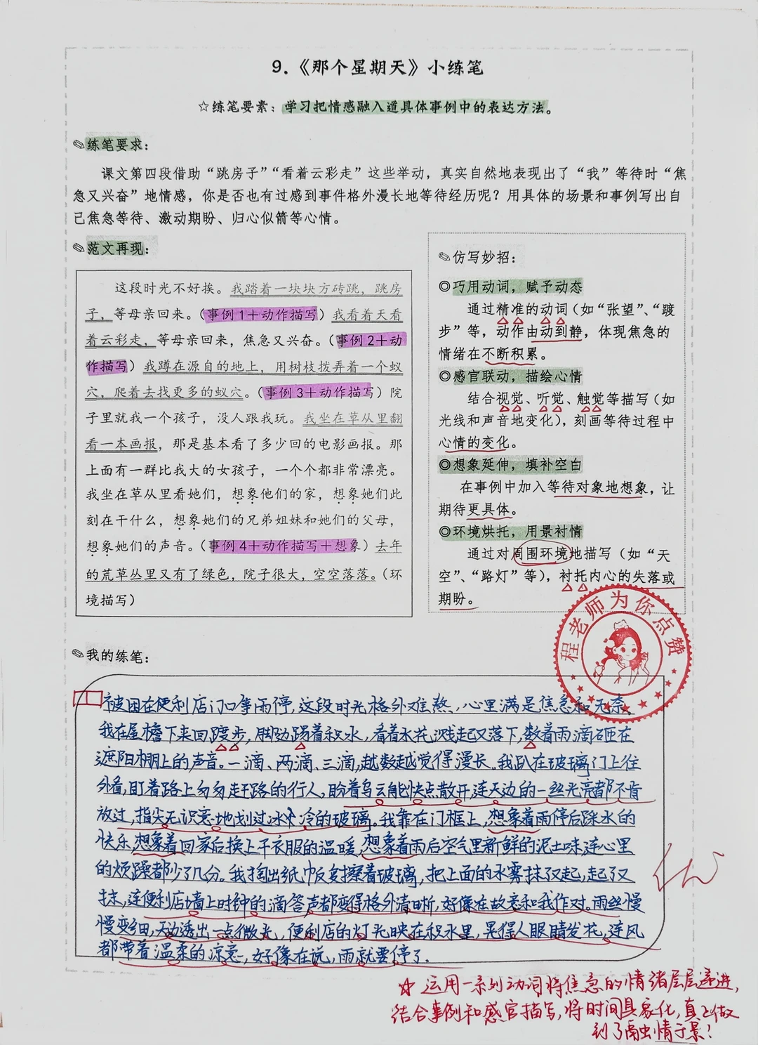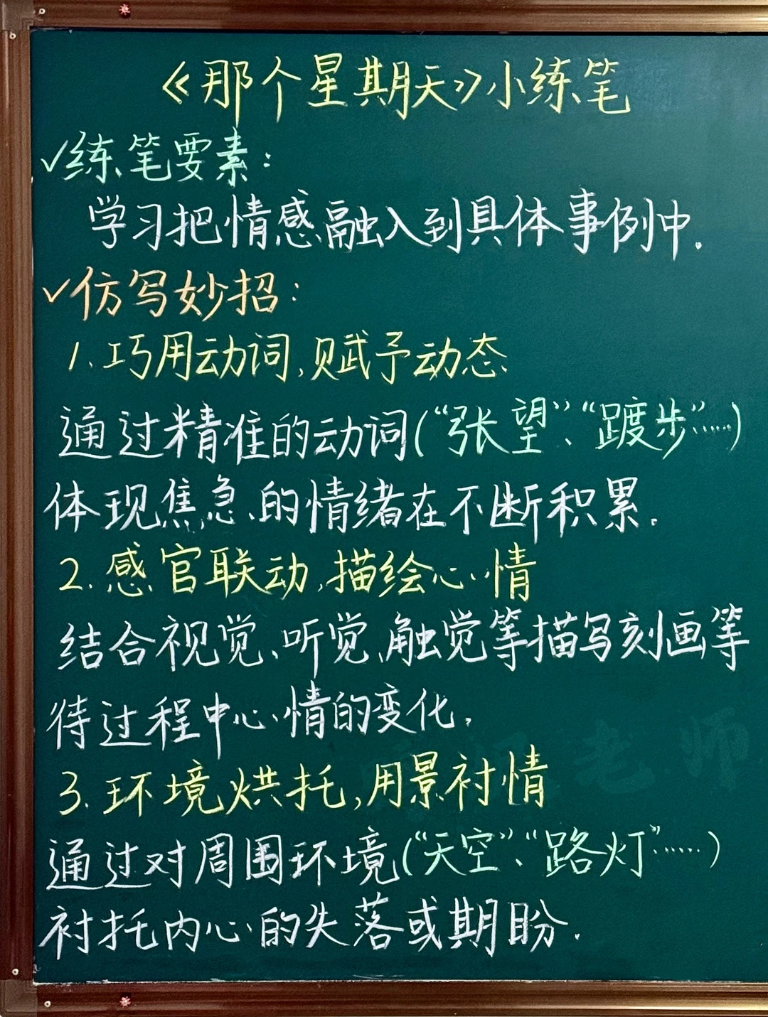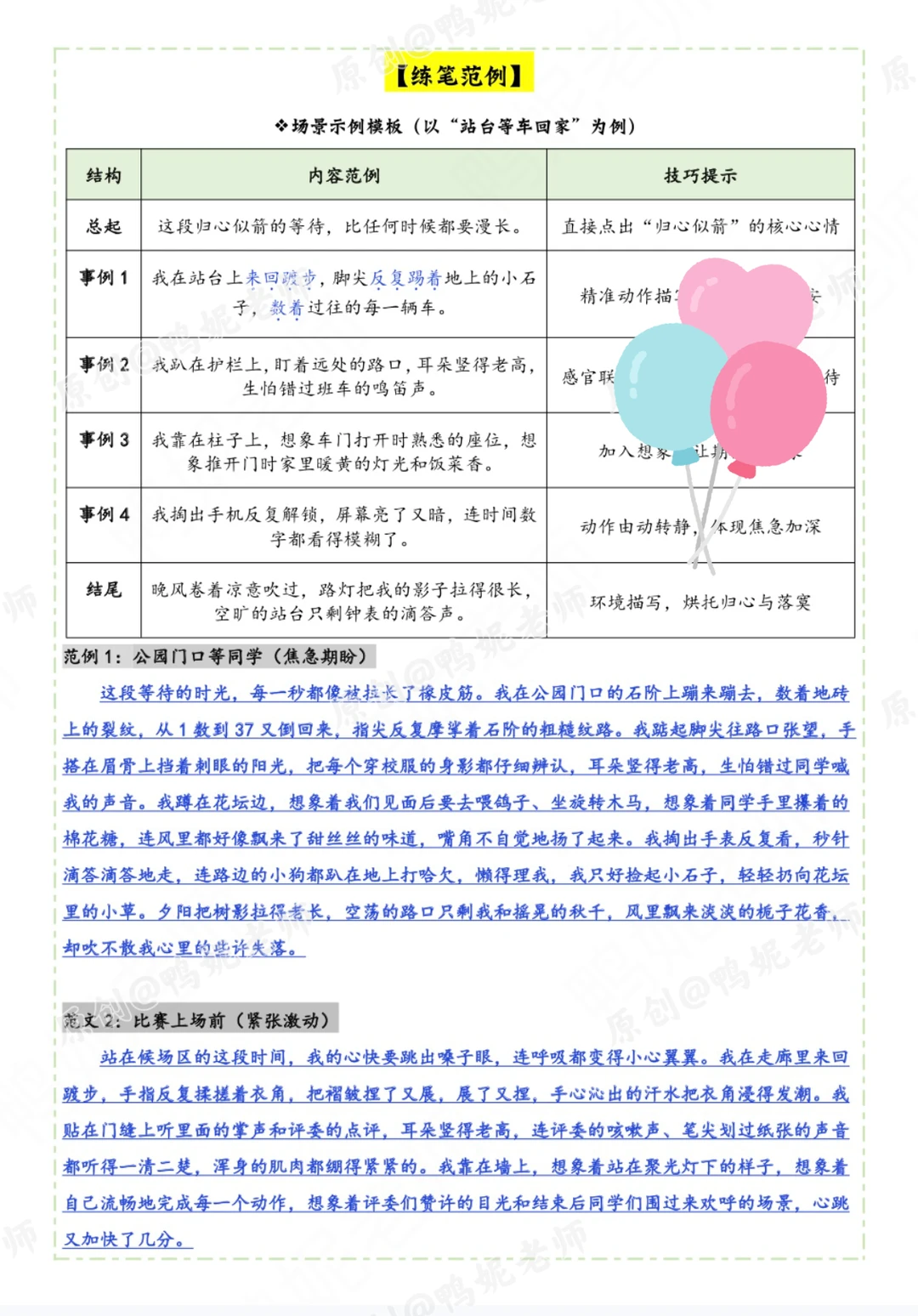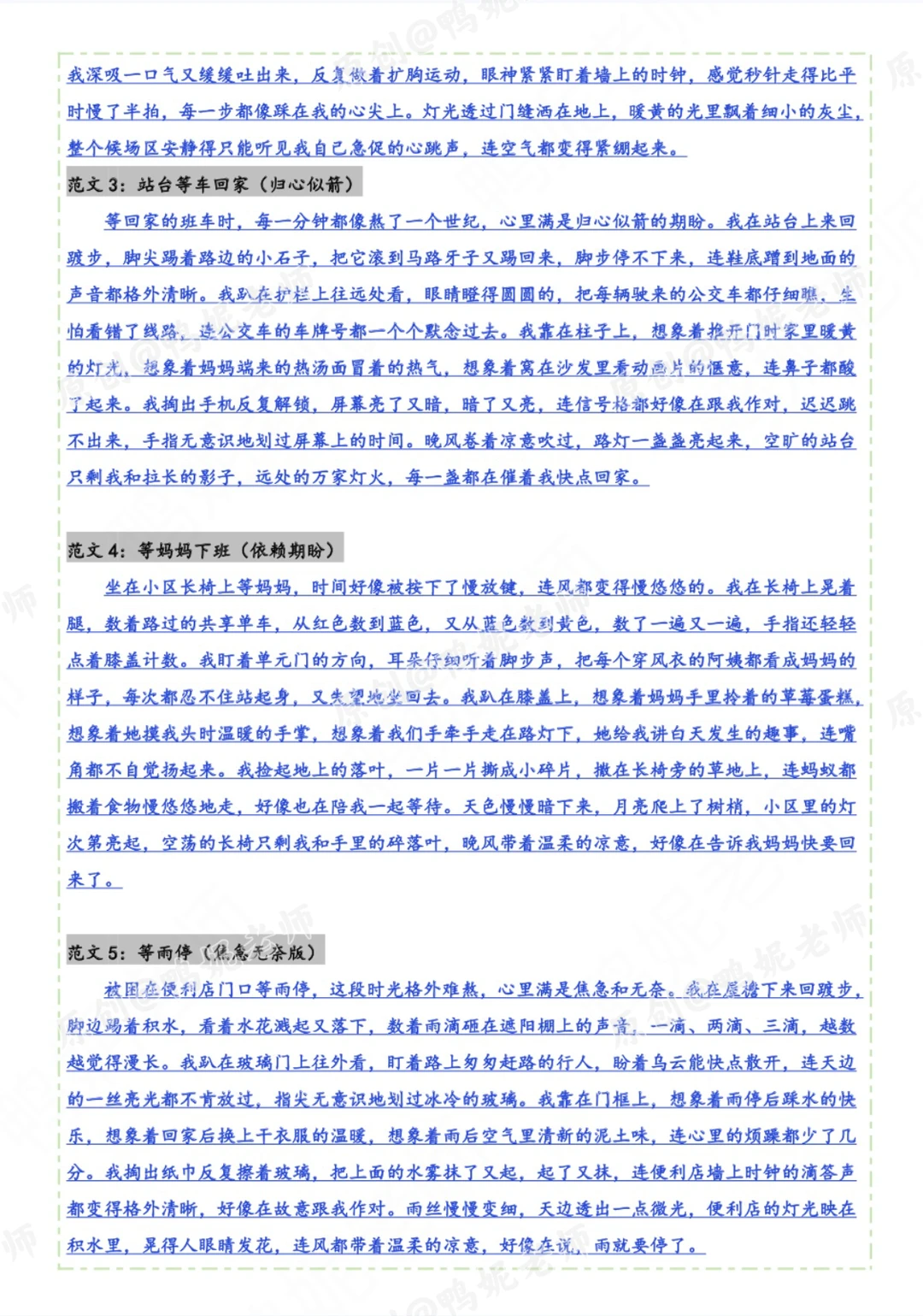 ✨仿写妙招: ①巧用动词,赋予动态 👉通过精准的动词(如“张望”、“踱步”等,动作由动到静,体现焦急的情绪在不断积累。 ②感官联动,描绘心情 👉结合视觉、听觉、触觉等描写(如光线和声音地变化),刻画等待过程中心情的变化。 ③想象延伸,填补空白 👉在事例中加入等待对象地想象,让期待更具体。环境烘托,用景衬情通过对周围环境地描写(如“天空”、“路灯”等),衬托内心的失落或期盼。
