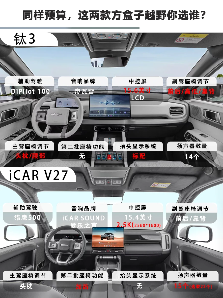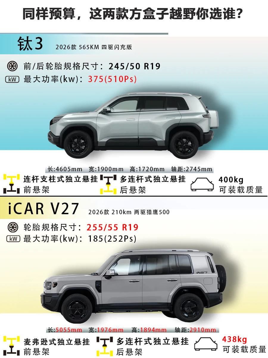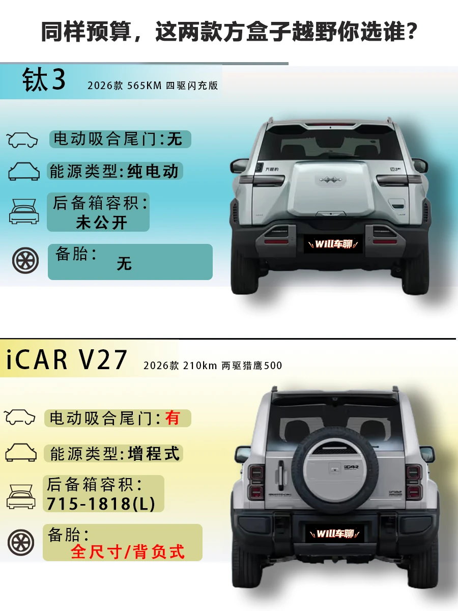 两台16.98万同价位的方盒子硬派风格选手,钛3 2026款 565KM 四驱闪充版 VS iCAR V27 2026款 210km 两驱猎鹰500,看完不再纠结!(以下按品牌车型简称钛3和iCAR V27)