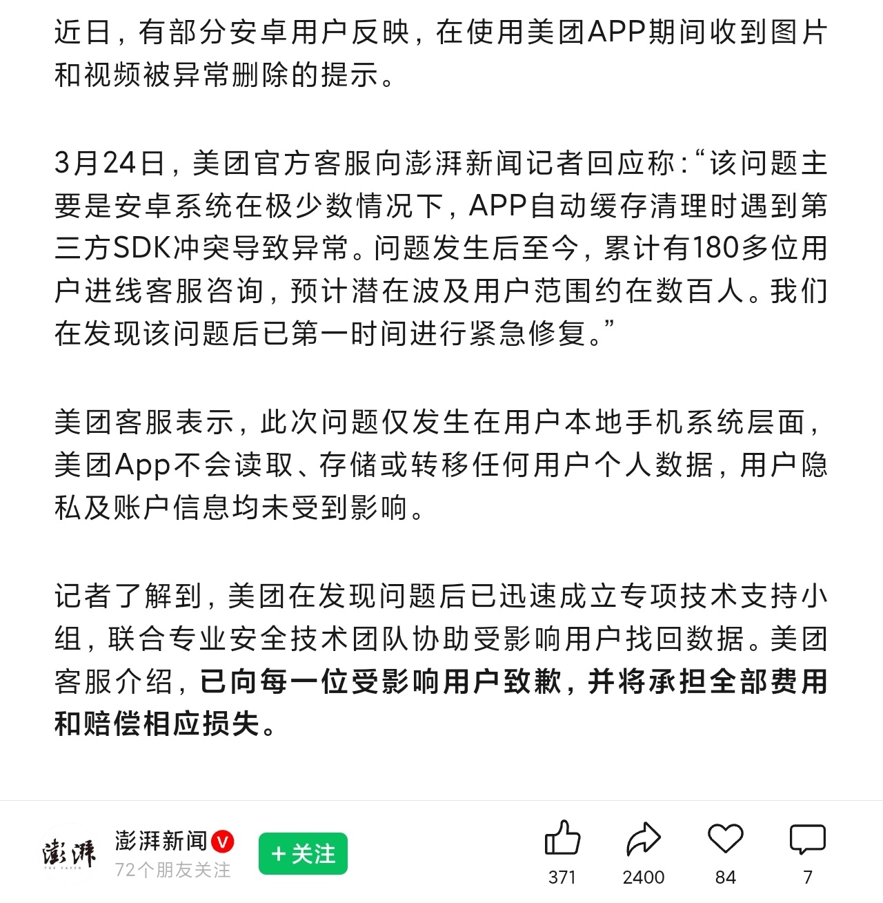 照片被删除怎么计算损失……估计美团的程序员在测试龙虾了美团将向被删照片用户赔偿损失