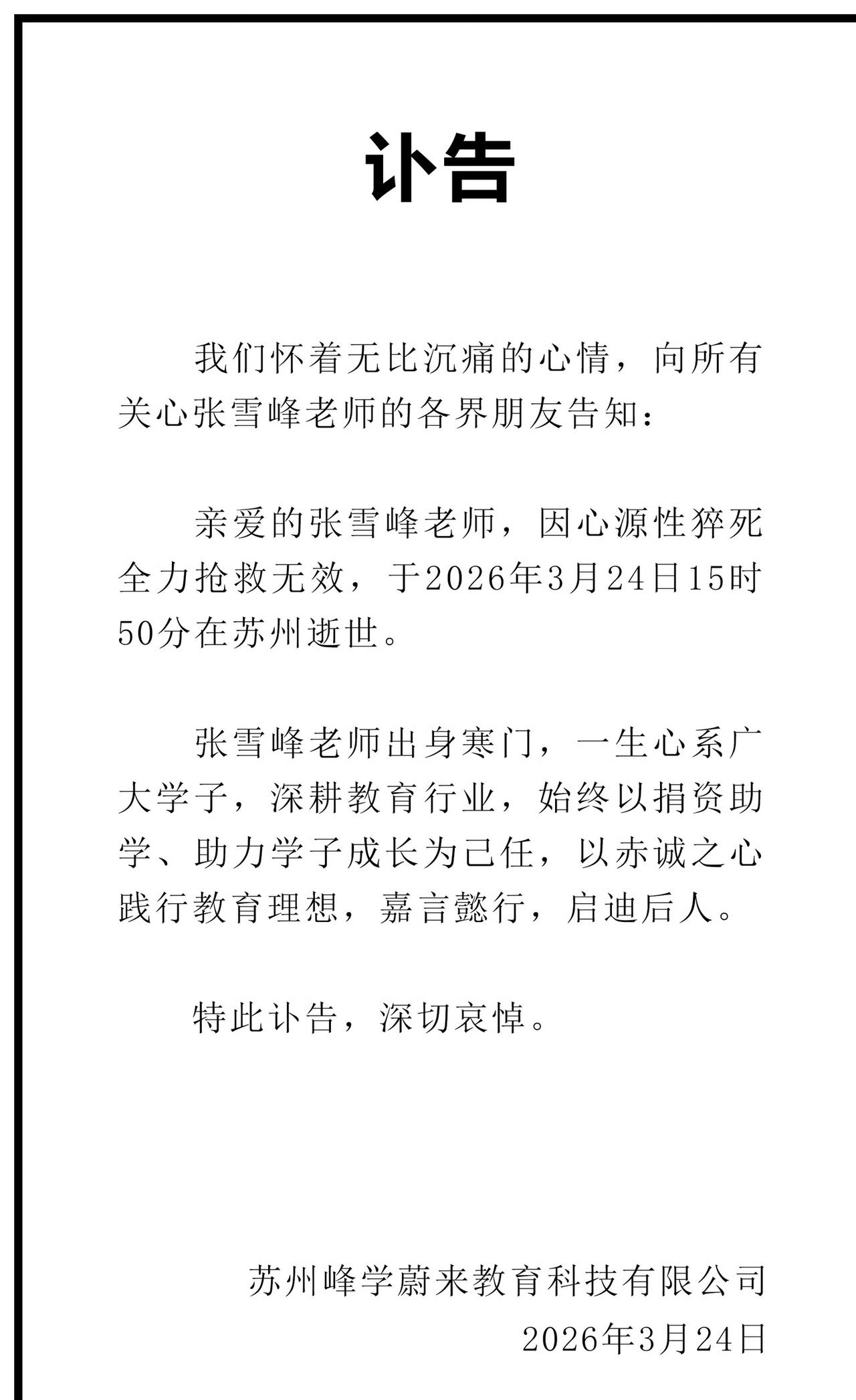 知名教育博主、考研名师张雪峰老师突然离世了,张雪峰老师所在的苏州峰学蔚来教育科技有限公司,正式发布了讣告,确认了这一不幸的消息。 当天张雪峰老师在公司里跑步后,突然感觉身体不适,情况看起来挺严重的,同事们赶紧把他送到了附近的医院进行紧急抢救,可是,尽管医生们全力以赴,张雪峰老师还是因为心源性猝死,没能抢救过来,下午的时候,医院宣布了他离世的消息,这个消息一传出来,立刻就在网上引起了轩然大波,大家都不敢相信,那个总是充满活力、给学子们提供宝贵建议的张老师,就这样突然离开了我们。 张雪峰老师今年才40多岁,他出身寒门,但凭借自己的努力和才华,在教育行业闯出了一片天,他不仅在考研指导方面有着深厚的造诣,还经常在社交媒体上分享高考志愿填报的经验,帮助无数考生和家长解决了燃眉之急,他的直白、接地气的风格,深受大家的喜爱,也让他在网络上积累了大量的粉丝。 除了在教育领域的贡献,张雪峰老师还一直心系广大学子,经常捐资助学,助力学子们的成长,他用自己的行动,践行着教育理想,也启迪着后来人。他的离世,无疑是对教育界的一大损失,也让无数曾经受过他帮助的学子感到悲痛。 他的社交媒体账号头像也变成了黑白,似乎也在为他的离去默哀,公司方面表示,目前各项业务还在正常运营,服务有序,团队稳定,学员与员工的权益都有充分保障,苏州工业园区和相关部门也表示,会继续关心和支持公司的发展,公司和家属也在全力做好相关的善后工作,感谢社会各界一直以来对张雪峰老师和公司的关心和支持。教育大v张雪峰 上海交大张雪峰 张雪峰 事件来源:搜狐科技