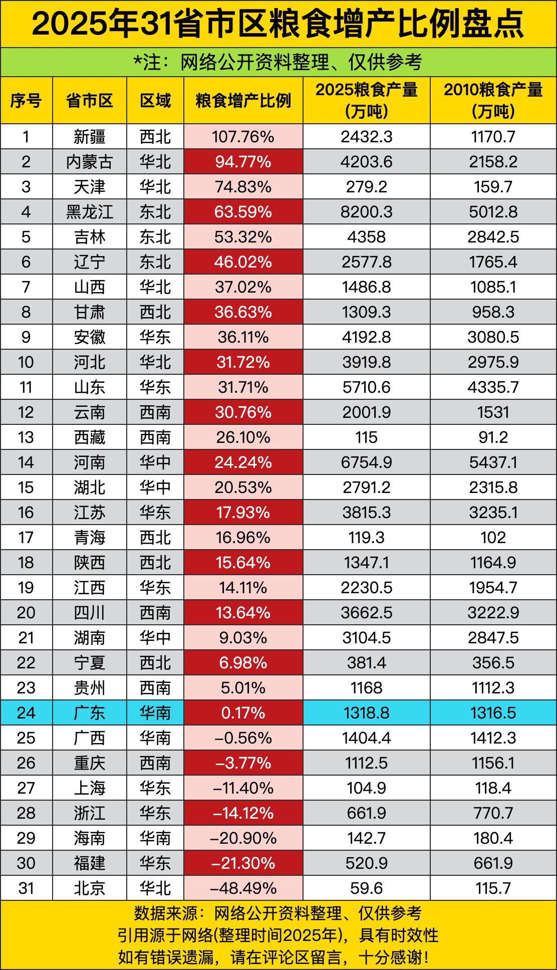 新疆这老哥简直开挂,粮食增产107.76%,15年翻了一倍还多。从1170万吨干到2432万吨,这增长速度比房价还猛。关键是新疆那地方,戈壁沙漠占了一大半,愣是靠滴灌技术硬生生种出个粮仓。内蒙也不差,增产94.77%,从2158万吨飙到4203万吨,草原变粮仓,这操作服了。 黑龙江、吉林、辽宁这东北三兄弟,增产63.59%、53.32%、46.02%,一个比一个猛。黑龙江直接干到8200万吨,全国第一产粮大省,名副其实的北大仓。吉林也猛,从2842万吨到4358万吨,硬生生多出个青海省的产量。辽宁虽然差点,但也是实打实的增产。东北黑土地,中国饭碗的压舱石,不是吹的。 再看看南方那些省份,简直惨不忍睹。福建减产21.3%,浙江减产14.12%,海南减产20.9%,广东基本持平。这些地方经济倒是发达,粮食却越种越少。浙江从770万吨跌到661万吨,福建从661万吨跌到520万吨,广东1318万吨,15年才增了2万吨,还不够塞牙缝的。南方的地都拿去盖房子了,谁还种地啊? 最惨的是北京,直接腰斩,减产48.49%,从115万吨跌到59万吨。首都人民都不种地了,反正有钱买粮。上海减产11.4%,从118万吨到104万吨,也不遑多让。这些大城市,地皮比粮食贵,种地不如盖楼,谁还种粮食?反正全国粮仓多得是,东北西北兄弟扛着,北京上海只管花钱买就完事了。