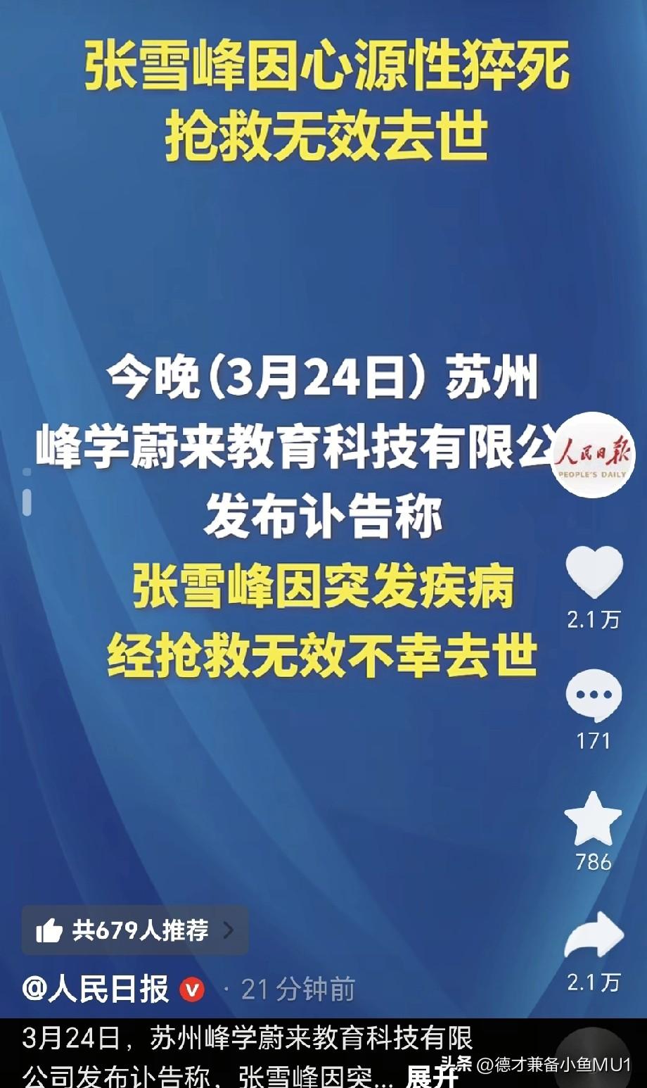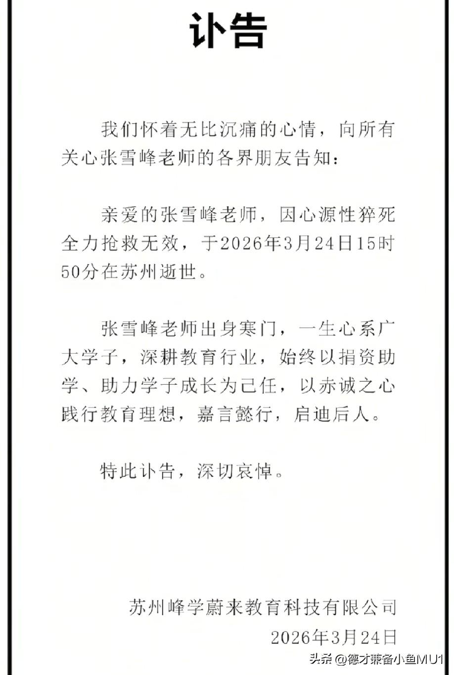 人生苦短,你永远无法预知明天和意外哪个会先到来,一切都太过突然。 刷到消息的瞬间,我整个人一下子愣住,心猛地一揪,许久都回不过神来。 一直以来,您用最直白的话语,点醒了无数迷茫之人,为无数家庭照亮了前行的道路。 人要学会避谶,以吉言护身,慎言以避祸。 张雪峰在直播时说:“如果有一天我死了,各大平台会有个热搜叫张雪峰死了。”是不是有时候真会有这样的预感呢?为何会聊到这个话题? 话不可乱讲,要心存敬畏,方能平安顺遂。 我真的难以置信,也不愿相信这是真的。我们还是要好好爱惜自己,别让自己太过操劳,毕竟钱财是挣不完的。天妒英才,您为社会做出了那么多贡献,还帮助了众多普通人家的学子,为何如此突然地就离开了呢?虽然我与您未曾有过交集,但也深感惋惜。张老师,一路走好!我的心里难受极了,久久难以平静……