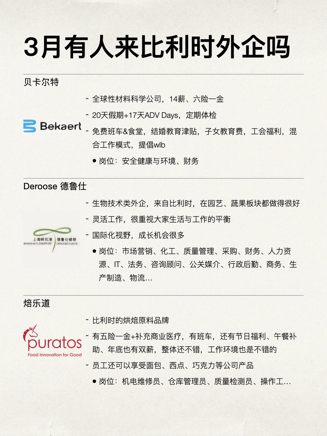比利时外企其实挺低调的,但很多都在细分行业里做得很深,比如食品、化工、材料这些方向,业务都很稳,不太受大环境波动影响 整体氛围也完全是“欧洲系”的那种松弛感,不太强调加班文化。大多数都是 955、双休,年假 12–15 天起,有些公司还会有补充医疗、餐补、节日福利这些,整体待遇挺在线 很多团队规模不大,但流程规范、管理比较清晰,待着会比较舒服。如果是想找一个不那么卷、能长期发展的环境,比利时外企其实真的不错 坚持日更✊🏻,对外企感兴趣的欢迎常来看看