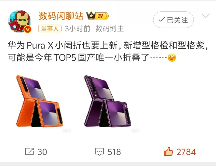 曝华为PuraX阔折叠手机将上新只是更新了两款新配色,不是新款上线。不过下一代Pura X2也快了,估计今年上半年能看到。去年的华为Pura X小阔折确实卖的好,尺寸讨喜销量不错,不然苹果、三星这两巨头为啥都相继跟进,要推出同款折叠