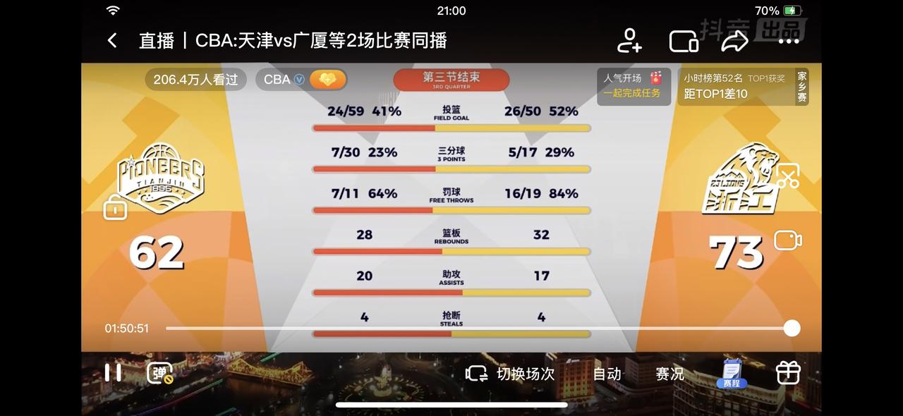 天津男篮虽然落后,但是还是咬住比分。 在刚刚结束的天津男篮主场迎战浙江浙商证券男篮的第三节比赛中,天津先行者男篮暂时以62比73落后。 从第三节比赛中可以看到,天津队的三分球有了起色,大卫.詹姆斯和郑浩然表现出色。反观浙江队,依然是大秋和外援塔克、桑普森表现出色。 天津男篮打的比较顽强,但是最终还是会输的!