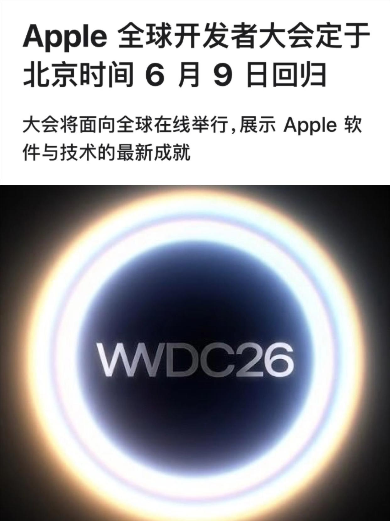 很突然啊!苹果大舞台官宣日期了 苹果WWDC 2026定档6月9日举办,大的要来了? 预计发布新一代系统👇 iOS 27、iPadOS 27、macOS 27、watchOS 27、tvOS 27、visionOS 27 感觉好多人还没更新iOS 26,27这会就要来了,不知道今年国行iPhone到底能不能用上AI啊?大家期待吗?